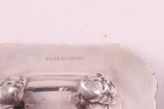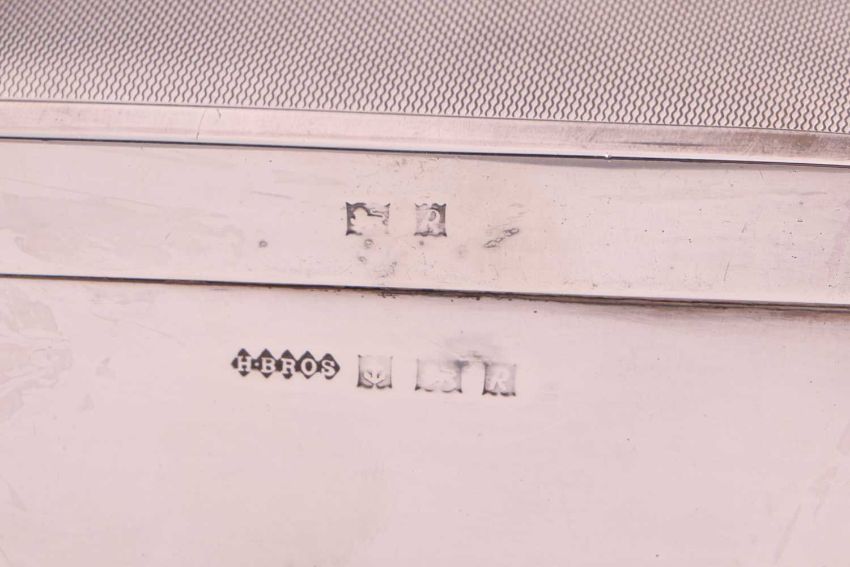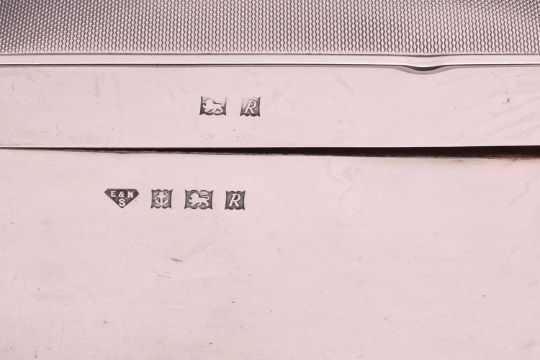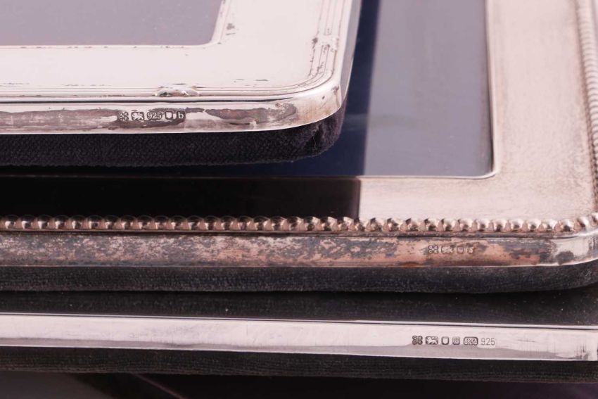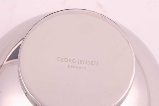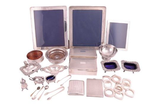 A large silver mounted photograph frame with a beaded border, 30cm x 25cm, another with ribbon border, 30cm x 25cm, another of plain form 21.5xm x 16cm, all with easel stands, two rectangular silver cigarette boxes with engine turned decoration, a silver plated coaster, a white metal coaster with turned wooden base, two silver cigarette cases with engine turned decoration, a silver bonbon dish, a pair of silver plated salts with blue glass liners with matching mustard pot, a Mappin and Webb silver plated three piece cruet, a Georg Jensen "Living" Bowl and eleven silver plated napkin rings, weighable silver approximately 358.8 grams (11.5ozt).