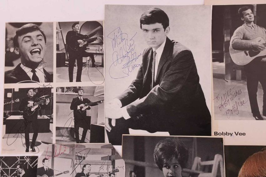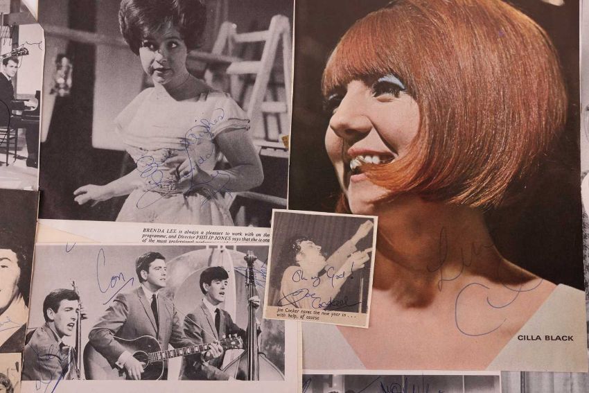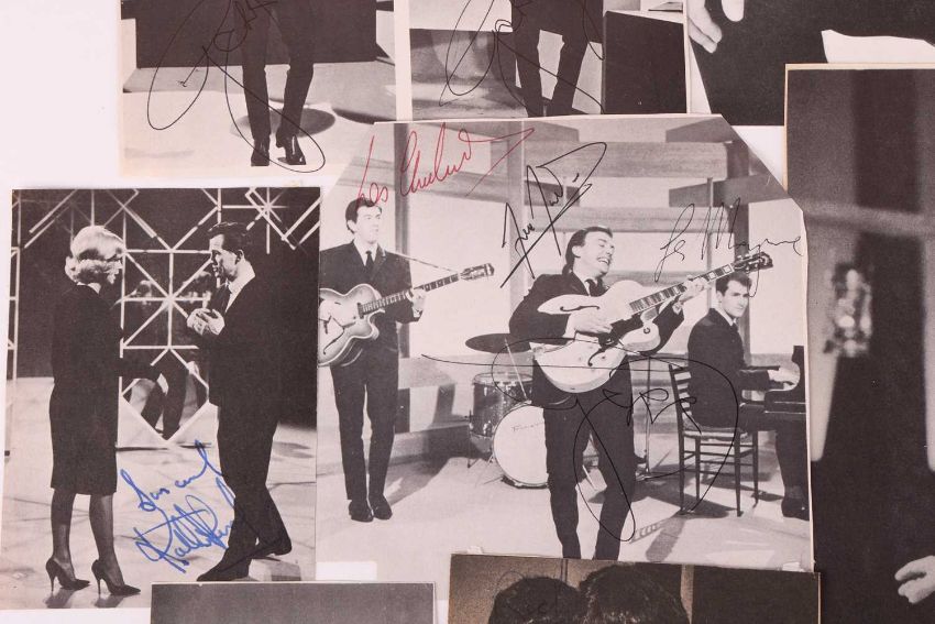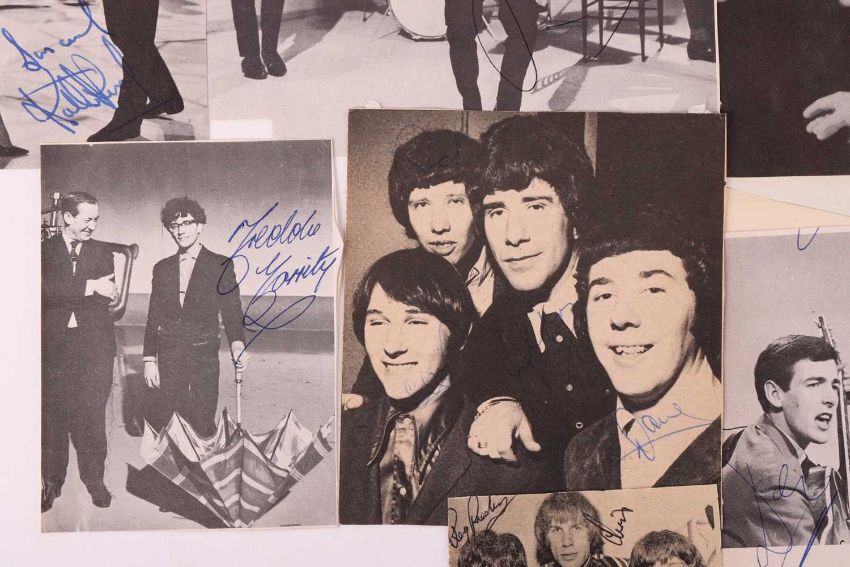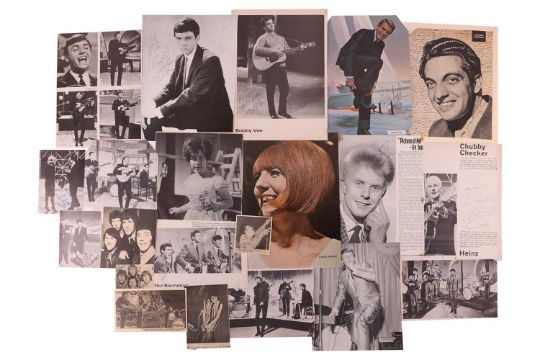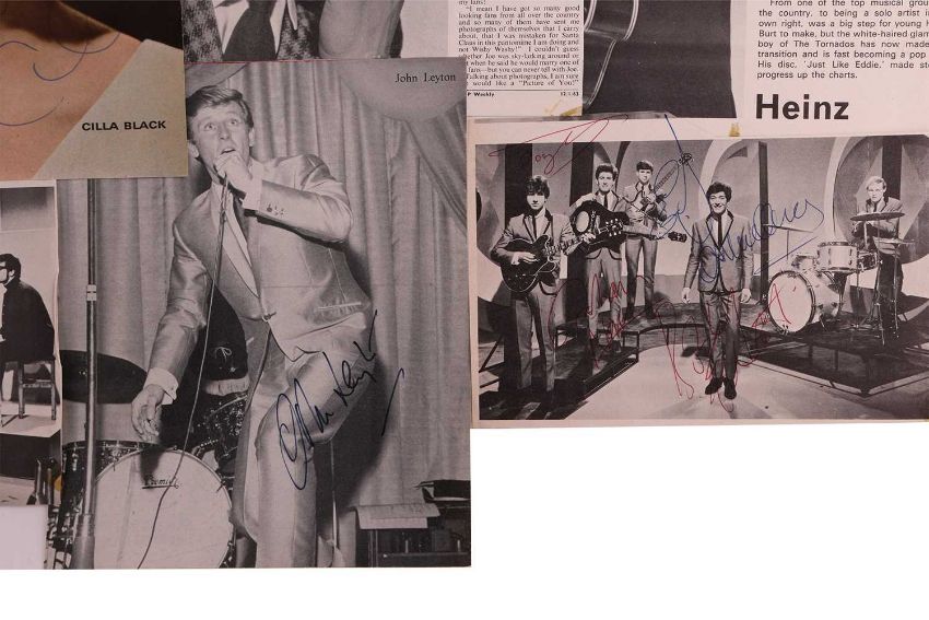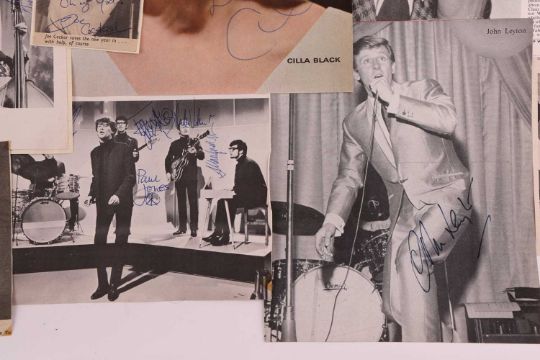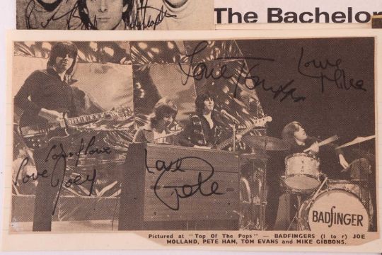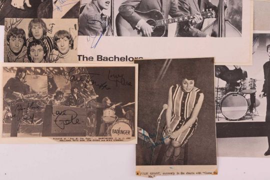Badfinger, newspaper cutting image depicted the band at ‘Top of the Pops’, Signed by Joe Holland, Pete Ham, Tom Evans, and Mike Gibbons,; Brenda Lee, Signed in blue ink on a black and white magazine page photo.; Julie Grant, Signed in blue ink on a black and white newspaper cutting photo.; John Leyton, Signed in blue ink on a black and white magazine page photo.; Joe Brown, Signed in blue ink on a black and white magazine page photo.; Adam Faith, Signed in black ink on a colour magazine page photo.; Gene Pitney, signed in blue ink on a black and white magazine photo.; Bobby Vee, signed in black ink on a black and white magazine page photo.; Cilla Black, signed in blue ink on a colour magazine page photo.; The Bachelors, signed in blue ink by Con Cluskey, Dec Cluskey and John Stokes on a black and white magazine page photo.; Manfred Mann, signed in blue ink by Mike Hugg, Paul Jones, Tom McGuinness, and Mike Vickers on a black and white magazine photo., and further signed on verso in blue ink by Freddie Garrity, vocalist with Freddie and the Dreamers.; Joe Cocker, signed in blue ink on a newspaper photo.; The Swinging Blue Jeans, signed on the lower portion of a magazine page by Norman Kuhlke, Ray Ennis, Les Braid, and Ralph Ellis;Frankie Vaughan, signed in black ink on a black and white magazine page photo.; Heinz Burt, and a few others. (qty).