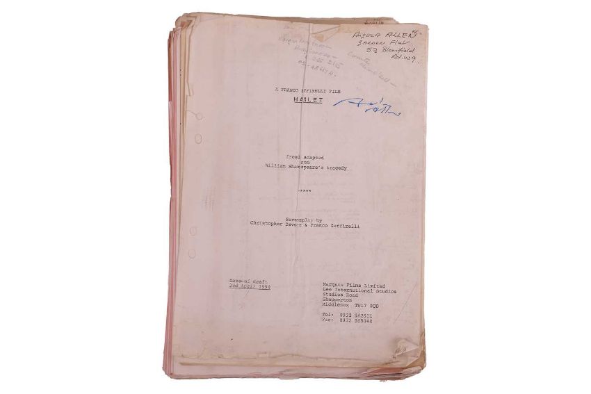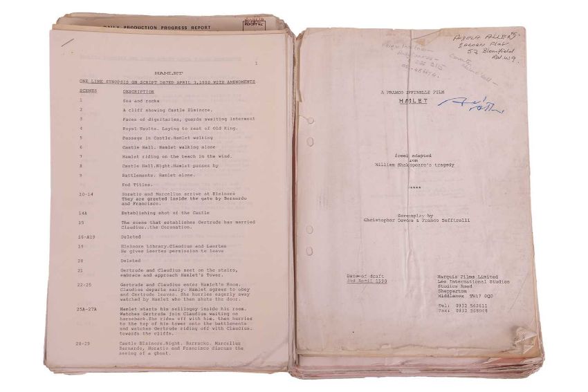 Hamlet (1990) Original draft working script, A Franco Zeffirelli Film, freely adapted from William Shakespeare’s tragedy, screenplay by Christopher Devore and Franco Zeffirelli, Marquis Films, Lee International Studios, Shepperton, dated April 3, 1990, Signed by Angela Allen in blue ink with her ownership name and pencil annotations to front page, unbound, 119-pages on white sheets with pink, yellow, and blue revision sheets, extensively annotated by Angela in pencil and ink throughout, 22 x 30cm; together with,a quantity of Angela’s original Continuity and Production documents, to include, 'Notes and Ideas given by Mel Gibson', July 30 1990; three Call Sheets for the shoot at Dover Castle, April 24-26,1990; Daily Production Report Progress Reports (complete) nos. 1-64, which record events behind-the-scenes during the shoot and mishaps that occurred on the production.