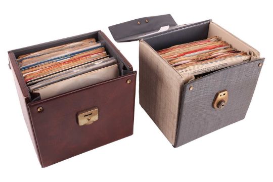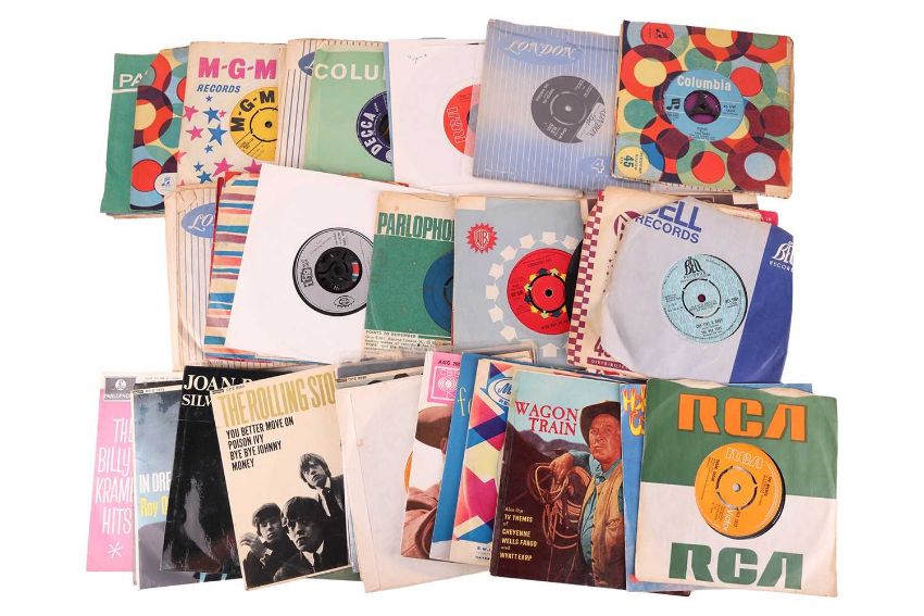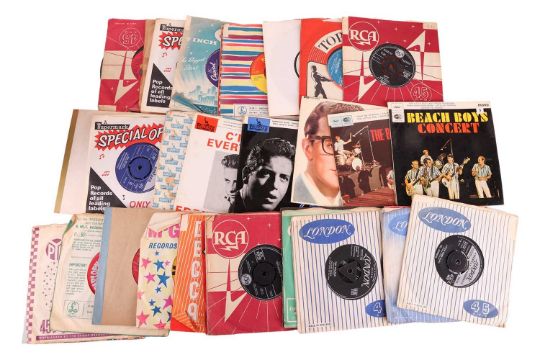 The Rolling Stones Harlem Shuffle, Five by Five, Bye Bye Johnny, 19th Nervous Breakdown; The Beatles Penny Lane; and others by artists including,The Animals, Billy J. Kramer, Rod Stewart, Roy Orbison, Brenda Lee, Joan Baez, The Sweet, Neil Sedaka (x 3), Joe Brown, Everley Brothers (x3) James Brown, The Beach Boys (x 4), Chuck Berry (x2), Del Shannon (x3), Dave Dee Beaky Mick & Tich, Dave and Ansil Collins, Ray Charles, Same Cooke (x2), Adam Faith (x6), Connie Francis, Isaac Hayes, Wayne Fontana, Duanne Eddy (x2),The Troggs, Buddy Holly (x2), The Spencer Davis Group, Eddie Cochran (x5), and others; contained within two record cases with handles. (90+)