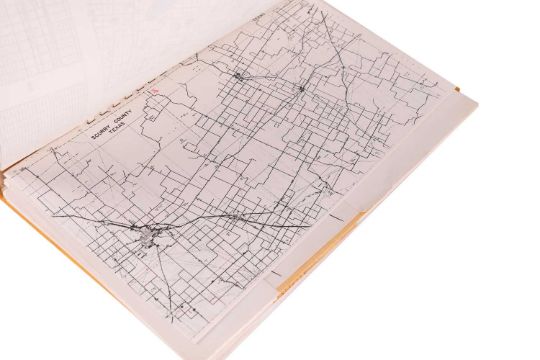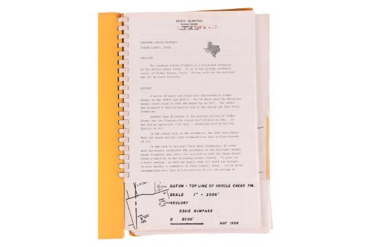 1980s Prospectus for Longhorn Canyon Prospect, Fisher County, Texas, where a series of major oil finds were discovered in the 1940s and 1950s, spiral bound yellow card covers with titled label and business card of George E. Vaughan, Austin, Texas stapled to the top right corner of front cover, comprises: forty-seven page prospectus to include facsimile reports, maps, and graphs; fifty-page Operating Agreement relating to the proposed extension of the Barbara Moore Oil Field, Longhorn Canyon, Austin, Texas, Signed by numerous investors including American actor Guich Koock, who played Eddie Rand in North Dallas Forty (1979) and writer, Alan Froud. (28)