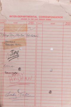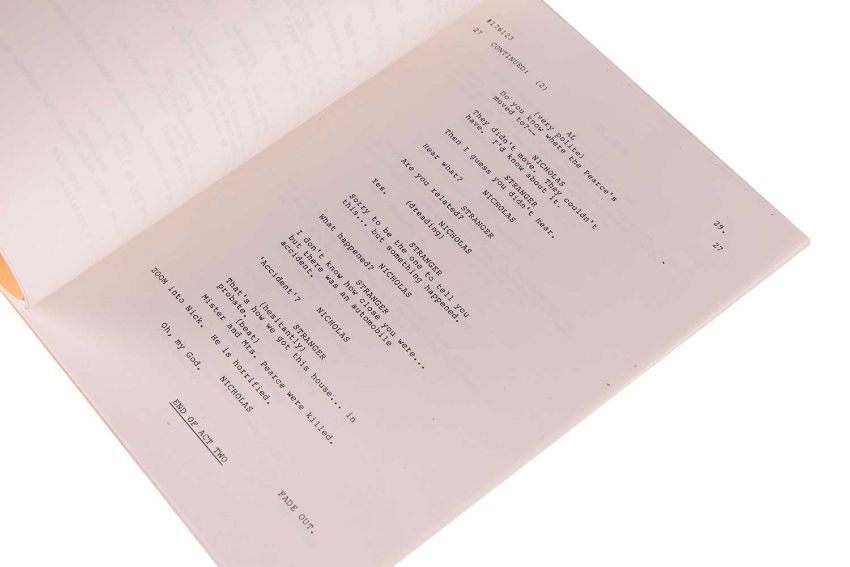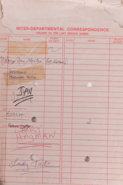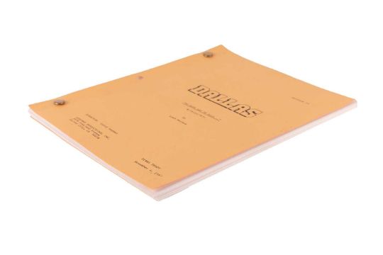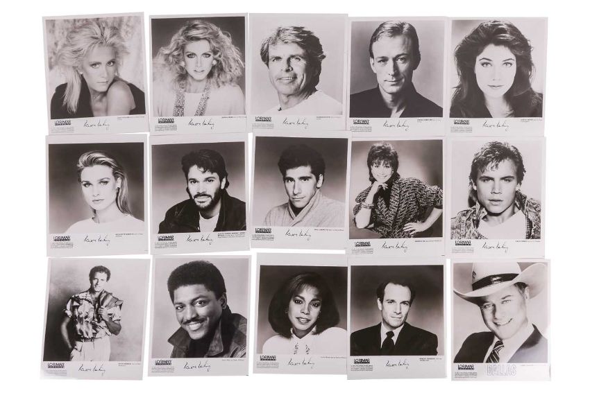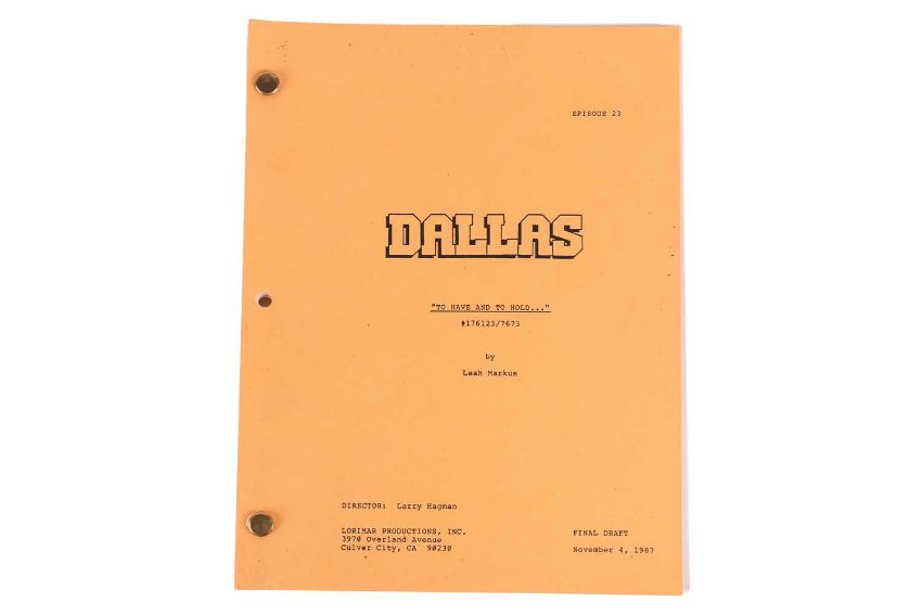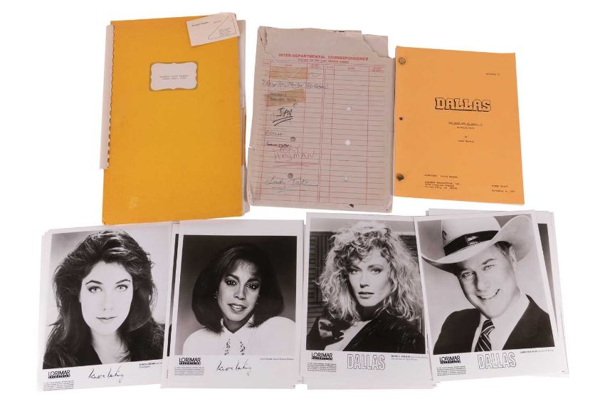 Dallas (American TV series 1978-1991) Original Production Script, Final Draft, 'To Have and To Hold . . . , 176123/7673, series 11, episode 23, Directed by Larry Hagman, Lorimar Productions Inc., Culver City, CA 90230, dated 4th November, 1988, yellow card covers with two brass brads, includes fifty-eight pages of script, one-page cast list, one-page set list noting interior and exterior sets such as Southfork, Cliff’s condo, April’s condo, Clayton’s office building, and Barnes-Wentworth reception area, 22 x 28cm, contained within an original Production buff coloured-envelope with red printed text which reads, ‘Inter-Departmental Correspondence Deliver to the Last Person Named’, with names listed to the front in red and black ink, including ‘Mary Van Houten’, ‘Residuals Production Building’, ‘Jav’, ‘Guich’, ‘Patrick Duffy’, ‘Larry Hagman’ and ‘Lady Tate ‘25 x 33cm; together with, 10 black and white publicity photographs depicted cast members, Ken Kerveval (Cliff Barnes) Linda Grey (Sue Ellen Ewing), Andrew Stevens (Casey Denault), Charlene Tilton (Lucy Ewing), Sheree J. Wilson (April Stevens), Howard Keel (Clayton Farlow), Larry Hagman (J.R. Ewing), George Kennedy (Carter McKay), Patrick Duffy (Bobby Ewing), and Barbara Bel Geddes (Ellie Ewing Farlow), each 8 x 10 inches.