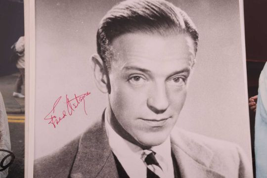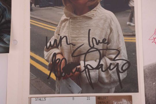 Fred Astaire, black and white photograph, Signed in red ink, 8 x 10 inches; Rudolph Nureyev, black and white photograph, the ballet dancer depicted as Rudolph Valentino in the film Valentino (1977) directed by Ken Russell, Signed by the ballet dancer in black ink, 8 x 10 inches; Elaine Paige, 6 x 8-inch colour photograph, Signed in black ink, with an Adelphi Theatre, London, ticket stub beneath for the stage show, Sunset Boulevard, 1995, both pasted down on card within removeable clear sleeve, 7 ½ x 10 ¾ inches overall; Hayley Mills, colour photograph, Signed in gold ink, 6 x 8 ½ inches; Frank Finlay, colour photograph, Signed in blue ink, 6 x 8 inches; Jenny Seagrove, colour photograph, Signed in black ink, 6 x 8 ½ inches; Sue Holderness, colour photograph, Signed in black ink, 6 x 8 inches; Geoffrey Huges, colour photograph, Signed in black ink, 8 x 6 inches; and Joe Brown, colour photograph, Signed in black ink, 7 x 5 inches. (10)