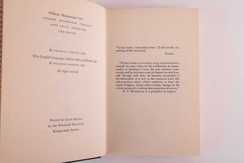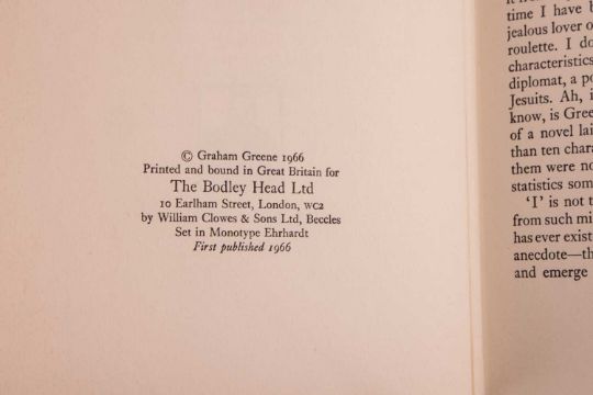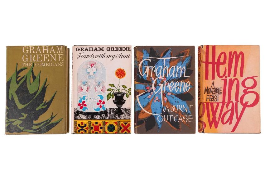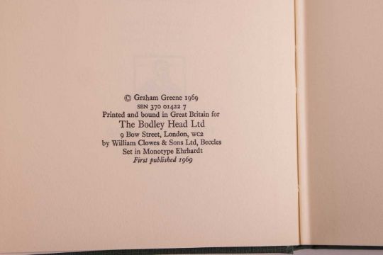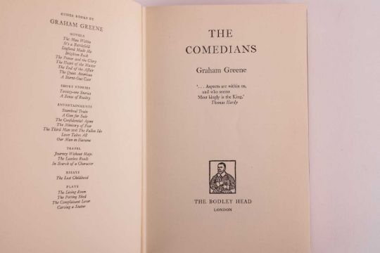 GREENE (Graham). three volumes, to include: A Burnt Out Case, first UK edition, dust-jacket, Green’s acclaimed novel set in the Belgian Congo, published Heinemann 1961; The Comedians, dust-jacket, the basis for the 1967 Golden Globe nominated film of the same title directed by Peter Glenville, starring Richard Burton, Elizabeth Taylor, Alec Guiness, and Peter Ustinov published The Bodley Head, 1966; and Travels with my Aunt, dust-jacket, loosely adapted from the author’s novel original for the 1972 film of the same title, directed by George Cuckor, starring Dame Maggie Smith, published The Bodley Head, 1969, 8vo. (4).