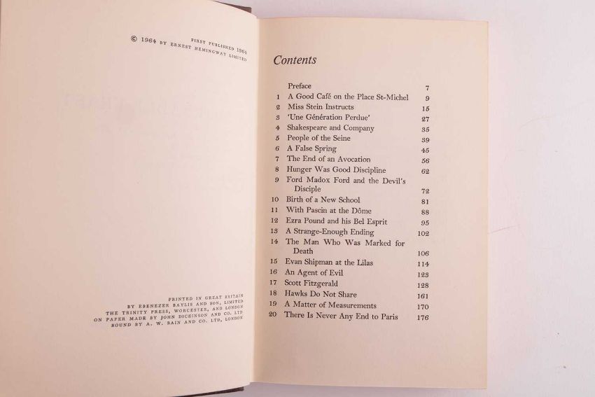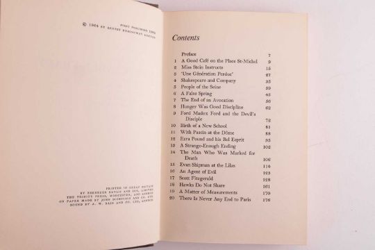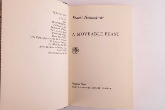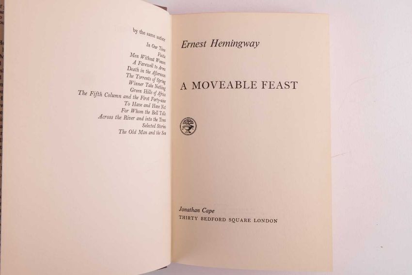 A Moveable Feast, half-title, dust-jacket design by Hans Tisdall, publisher’s original cloth, gilt, an autobiographical reminiscence of the author’s time as a struggling expat journalist in Paris during the 1920s, written and published just prior to his death, 8vo, Jonathan Cape, 1964; together with,