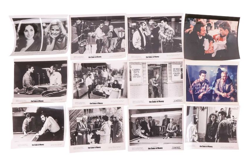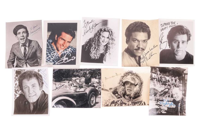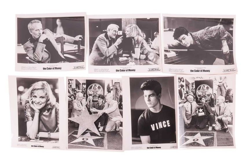 Together with a black and white photograph of Jim Carrey with a printed signature, a signed piece of card with illegable signature33; Colour of Money (1986) sixteen black and white press stills, two colour stills from the film and two photographs depicting Tom Cruise receiving his star on the Hollywood Walk of Fame. (qty).