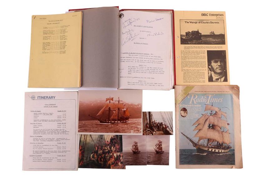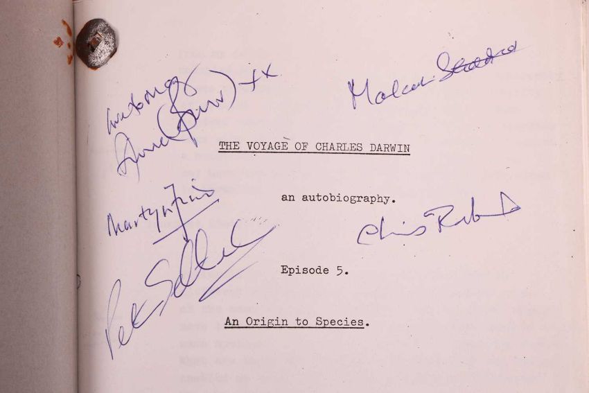 The Voyage of Charles Darwin: an autobiography, Episode 5, An Origin of the Species, Signed in blue ink on title-page by director, Martyn Friend, producer, Chris Ralling, and cast members, Malcom Stoddard (Charles Darwin), Andrew Burt (Captain Fitzroy), Peter Settelen (Lieutenant Sullivan), 223-pages on white sheets, including Rehearsal Script, revised 11.1.78, and white correction sheets bound in; and related documents loosely inserted, including Production itinerary for filming on locations in South America, all within red leatherette script folder, titled in black marker pen in Mary’s hand on spine, 23 x 33cm overall;