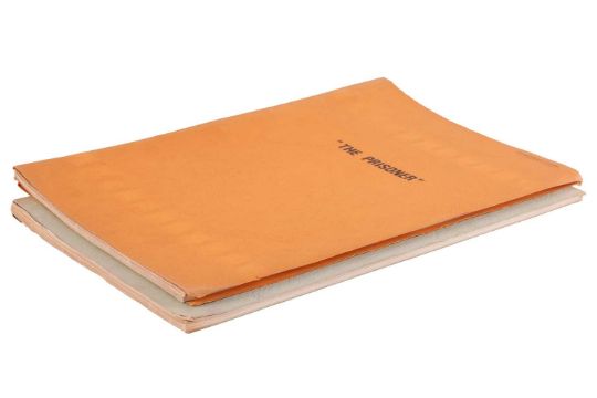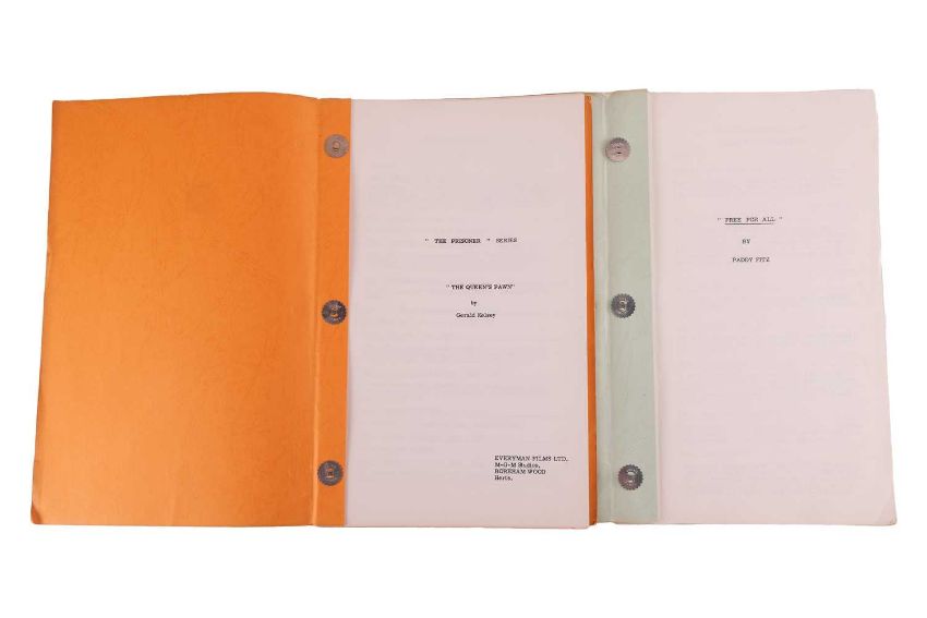 The first script: “The Prisoner” Series, “The Queen’s Pawn” by Gerald Kelsey, Everyman Films Ltd., MGM Studios, Borehamwood, Herts, undated, brad bound within titled orange card covers with ‘Construction’ handwritten in ink to top of front cover, 65-pages on white sheets, 21.5 x 33cm.