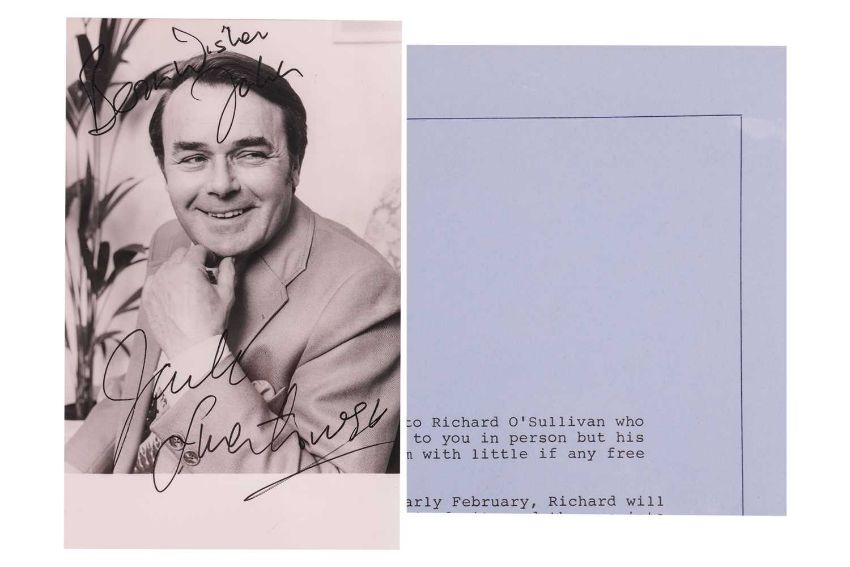 Richard O’ Sullivan, photograph signed by the actor and Typed letter signed on behalf of O’ Sullivan who was busy at the time appearing in ‘Aladdin’, with rehearsals scheduled for the West End show, ‘Run for Your Wife’.
