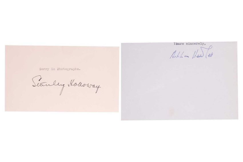 The Rt. Hon. Harold McMillan (1894-1986) former Prime Minister of the United Kingdom from 1957 to 1963, signed illustrated post card; Robert Stack signed card; Rex Harrison signed card; Dirk Bogarde signed postcard; Spike Milligan signed photograph and Typed Letter Signed ‘Love, light and peace, Spike’ on his printed headed notepaper, October 1981; Kathleen Turner signed card; Stanley Holloway, signed card with ‘Sorry No Photographs’ typed above; Arthur Hewlett Typed Letter Signed; Kenneth More signed card; Patrick Olive signed card; Carol Drinkwater and Christopher Timothy signed postcard; Bernard Bresslaw signed photograph and Typed Letter Signed, sent from Theatre Royal, Brighton, 1981; Isla Blair signed photograph and handwritten signed postcard; Denis Quilley signed photograph and Typed Letter Signed,1981, Las Vegas (American Television series 2003-2008) James Caan and Cast signed photographs, one with accompanying COA (x2); Racey promotional poster for the British pop groups’ third single ‘Some Girls’ released1998, signed by Richard Gower and three other band members, folded, 16 1/ 2 x 23 ½ inches; together with, Three military related First Day of Issue FDC, including, 25th Anniversary of the Formation of the Army Air Corps, postmarked September 1, 1982; 30th Anniversary ‘Operation Husky’ Invasion of Sicily, postmarked July 19, 1973; and 300th Anniversary ‘Battle of Texel’ postmarked August 11, 1973.