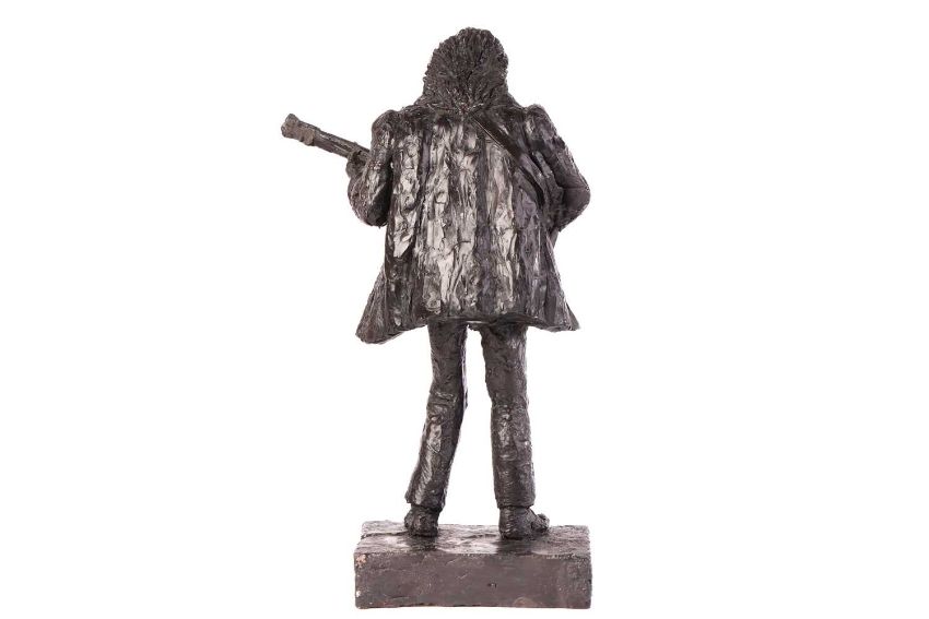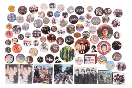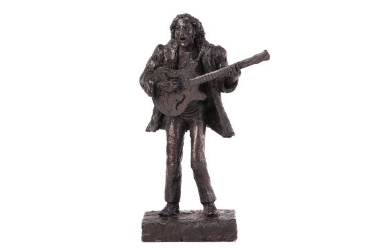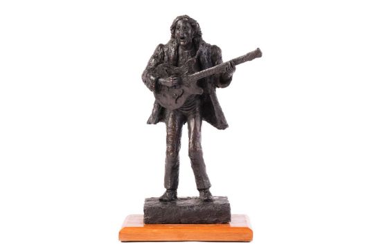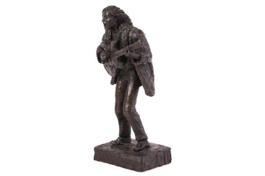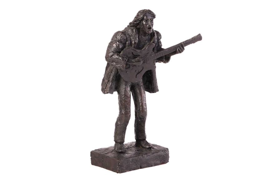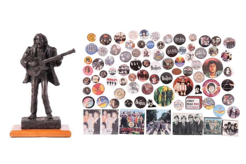 statuette modelled and cast by the artist in cold cast metals, bronze resin, this sculpture is number 7 in an edition of 10, signed to base of sculpture, based on John Lennon playing with The Beatles playing on the roof of the Apple offices, Saville Row, London, January 30, 1969, mounted on a wooden plinth of oak, H31cm, W20cm, D14cm, with base 34 x 23 x 17cm; with an accompanying certificate, together with a large collection of Beatles pin badges and fridge magents, and a small quantity of additional pin badges and memorabilia. (qty)
