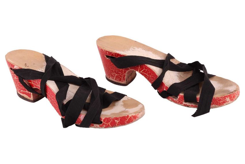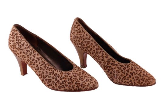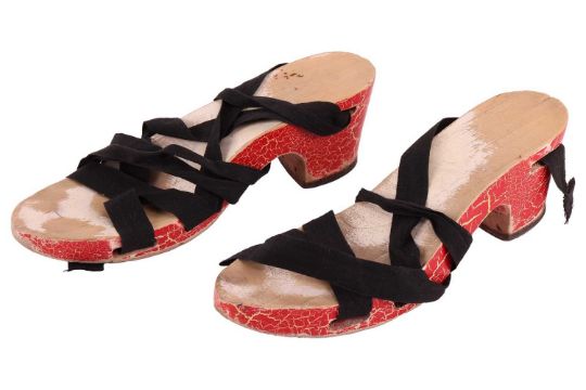 A pair of Vintage 1980s faux leopard print shoes; 1950s vintage italian wooden wedge sandals; and Schiaparelli stockings -