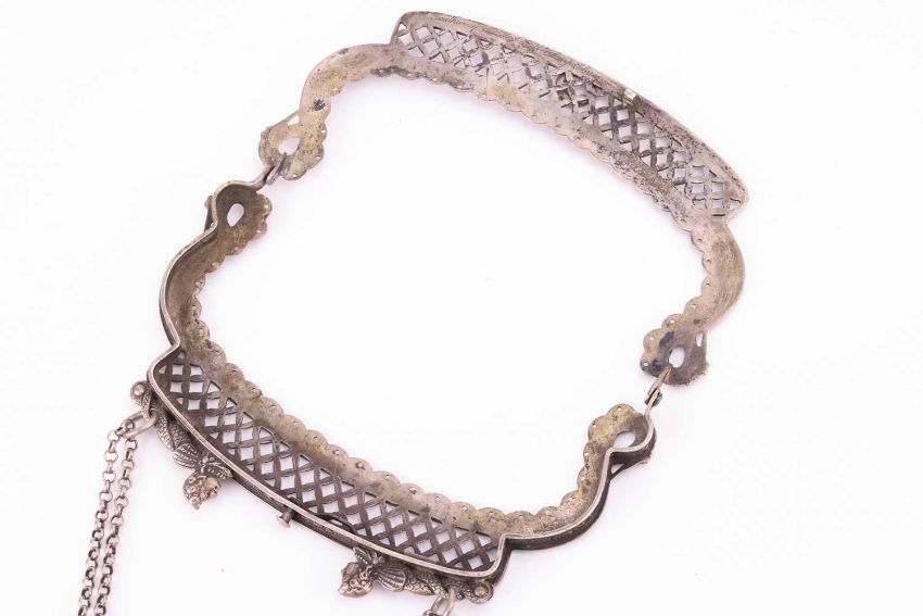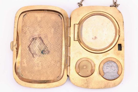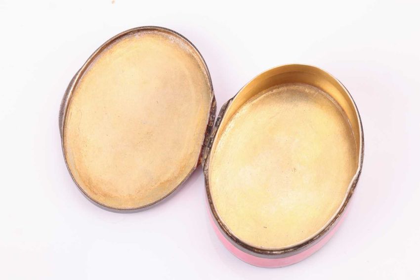Two enamel boxes and a white metal purse frame; the first box of oval form and pink guilloche enamel detail and gilt interior, cover detached, measuring 1.8cm x 5.5cm x 4.1cm; the second a sovereign holder on chain, the exterior decorated with green guilloche enamel and enamelled rose detail, with white enamel border, with chain and push button clasp, measuring 9.0cm x 6.3cm x 1.7cm (excluding chain); the white metal purse frame decorated with sphynxes and various mythical creatures, accented with crossed and foliate design, with chain attached and push button clasp, engraved internally ‘E. Gauthier 97 rue des Petits Champs. Paris’, measuring 15.5cm wide and 10cm tall (excluding chain); gross weight approximately 381.6 grams (3).