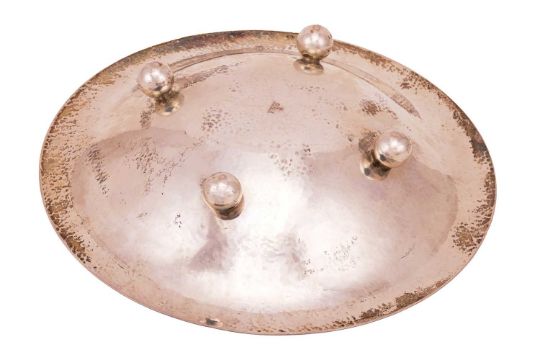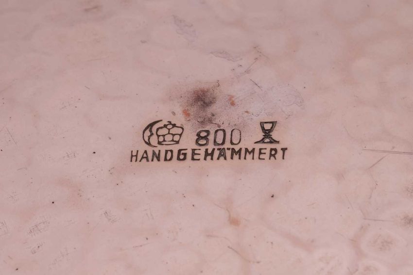 A large German planished bowl, with flared rim, on four ball feet, German marks '800' with maker's mark for Wolter Otto, 30.0 cm diameter, 805.89 grams (25.91 ozt).