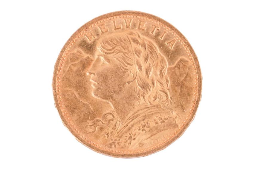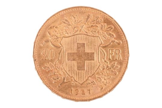 A Swiss franc 1927, diameter 21 mm, 6.5 grams, encased in "Zurcher Kantonalbank" plastic wallet.