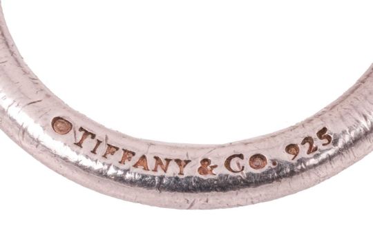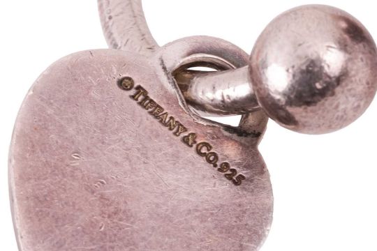 Tiffany & Co. - a silver keyring, with heart-shaped charm engraved "Key to my Heart", on a C-shaped open hoop with ball-ends, stamped "Tiffany & Co" "925", keyring approximately 3 x 3 cm, charm 2 x 2.5 cm, 21.3 grams.
