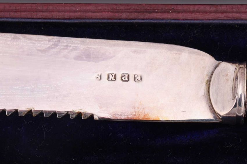 An aggregate of silver items and others; to include a two-handled presentation cup by Mappin and Webb, London 1918; another twin-handled cup by West & Son, Dublin 1911; a silver-mounted glass coaster cased set of eight teaspoons; a cased set of six coffee spoons with a pair of sugar tongs; four fiddle thread and shell dessert forks; six dessert spoons; and two further loose spoons; and a cased silver-plated serrated knife with mother-of-pearl handle; total weighable 1142.11 grams (36.72 ozt).