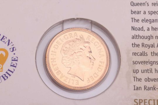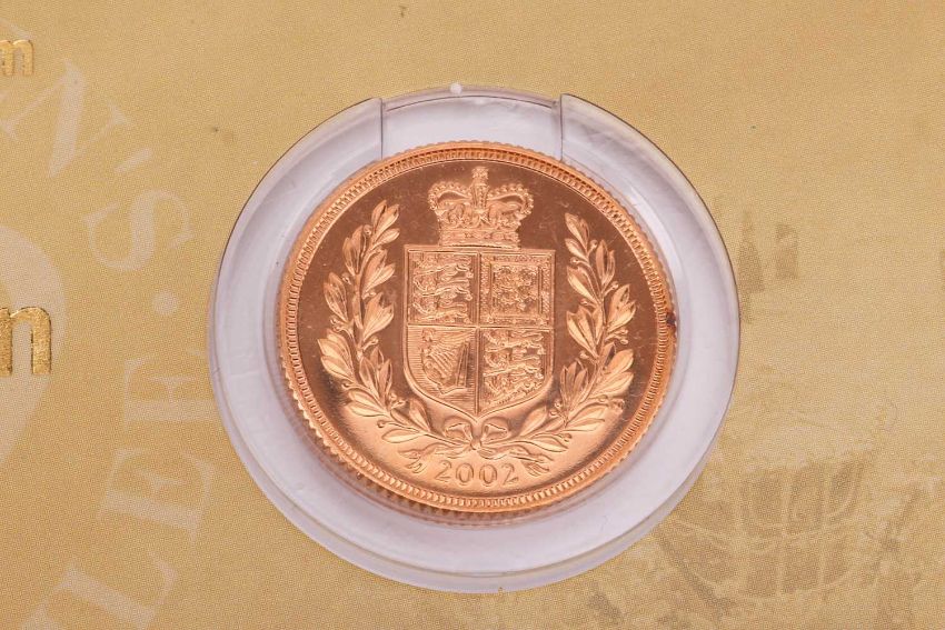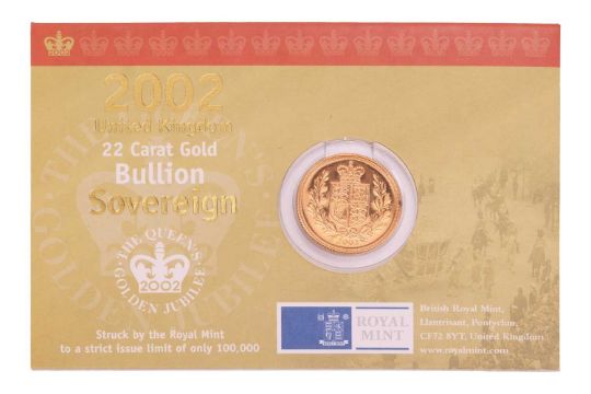 A 2002 Elizabeth II Sovereign, in Royal Mint 'Bullion' packaging.