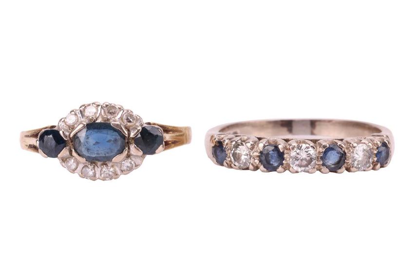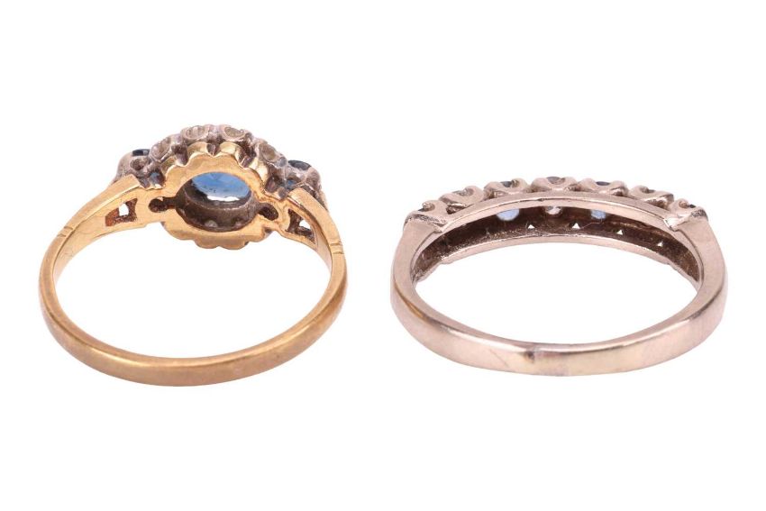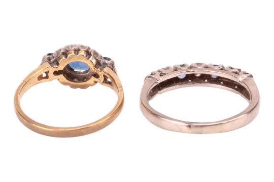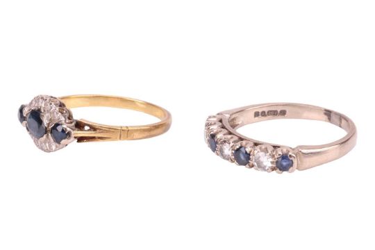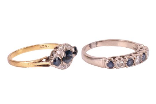 Two gem-set dress rings; to include a sapphire and diamond half hoop ring in 18ct white gold, alternating with circular-cut sapphires and round brilliant-cut diamonds, to a tapering flat shank, size Q; a sapphire and diamond cluster ring, the navette-shaped ring head centred with an oval-cut and two circular-cut sapphires, surrounded with single-cut diamonds, to a yellow metal shank marked '18ct', size O; Total weight of items 7.2 grams. (2)