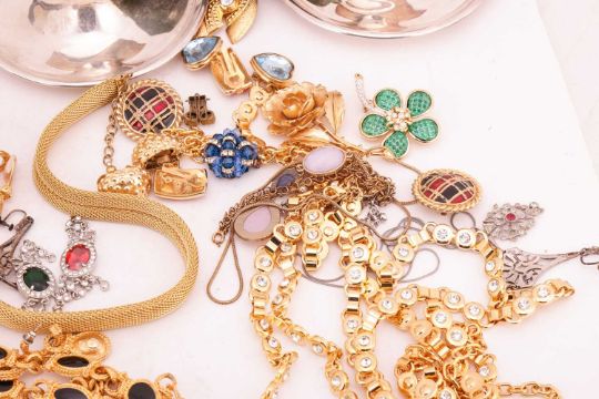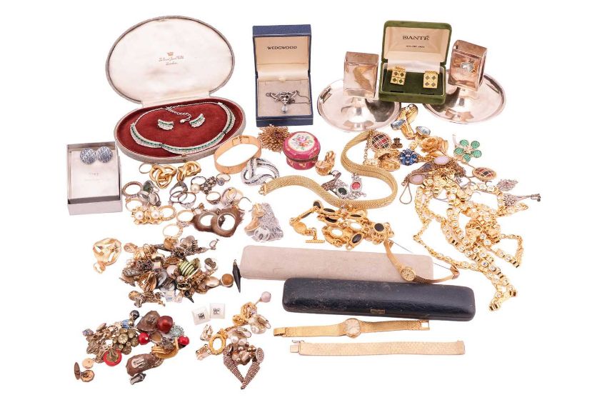 A quantity of jewellery; including two 9ct gem-set rings with British Hallmarks; a pair of cultured pearl floral cluster earrings, with clip fittings stamped "9CT" and a gem-set ring stamped "9CT", weighables 12 grams; a pair of Norwegian green guilloche enamel leaf earrings, marked '925S Sterling' & 'Made in Norway'; a Wedgewood sterling silver and paste pendant, boxed; together with two Rotary watches; gold-plated textured link bracelets and other items of costume jewellery and silver plate.
