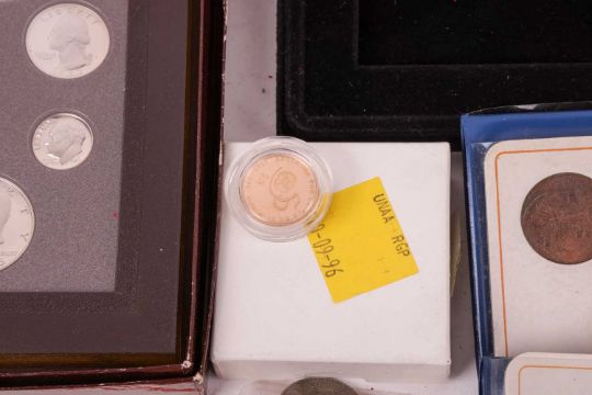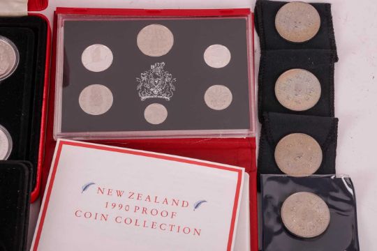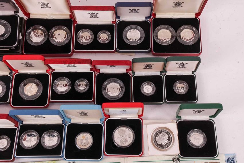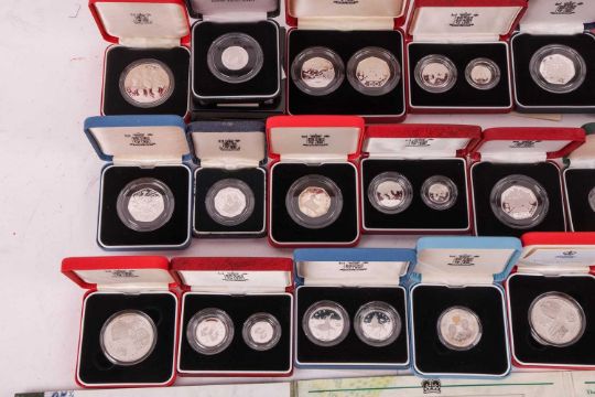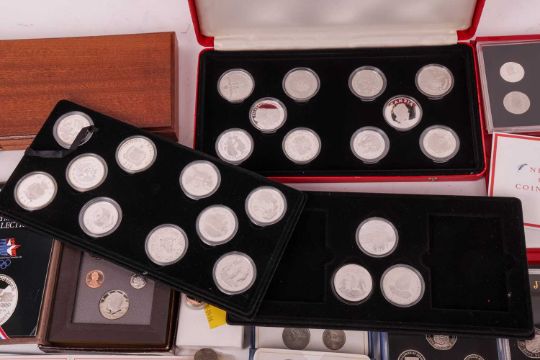 A large quantity of silver coins; including silver proof 50p, 20p, 10p, 5p and £5, together with a small quantity of silver dollars and other miscellaneous coins, majority encapsulated and boxed.