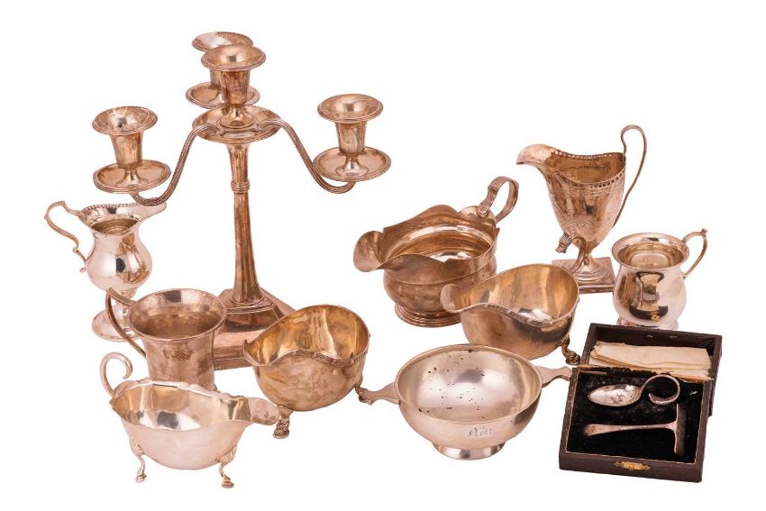 A collection of silver items to include; a George III helmet-shaped cream jug with bright-cut decoration, London 1793; a baluster cream jug on pedestal by James Deakin and sons; four sauce boats of various designs; two Christening mugs; a quaich inscribed 'Neil' by Emile Viner; a silver child's spoon and pusher set in case; and a loaded four-light, three-branch candelabra, by Adie Brothers Ltd., 24.5 cm high; total weighable 1093.28 grams (35.15 ozt).