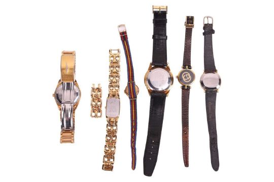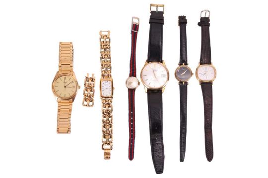 A group of watches; comprising a Longines gentleman’s gilt wristwatch, an Omega De Ville lady’s gilt wristwatch, a Seiko gilt wristwatch, a Seiko lady’s gilt wristwatch with additional links, a Gucci lady’s wristwatch and a CYMA lady’s wristwatch (6).