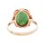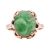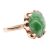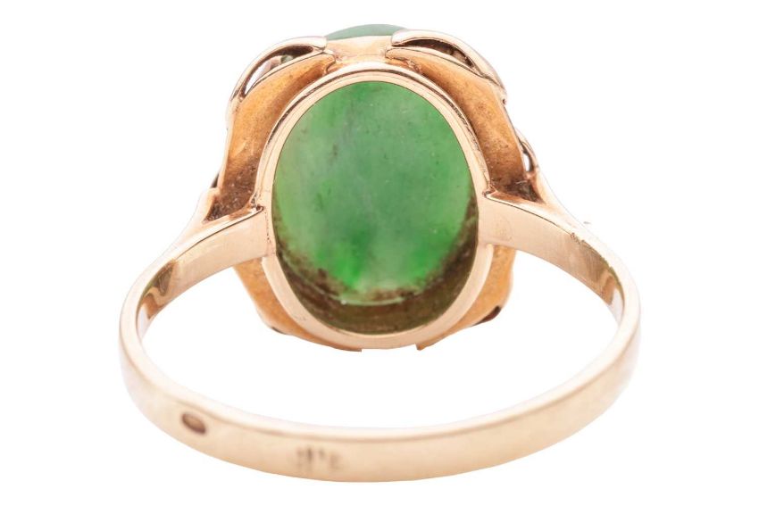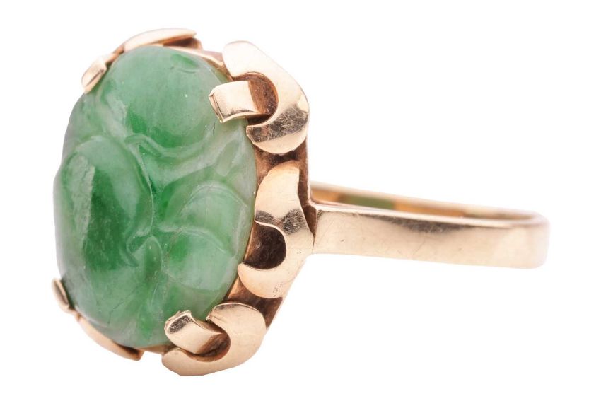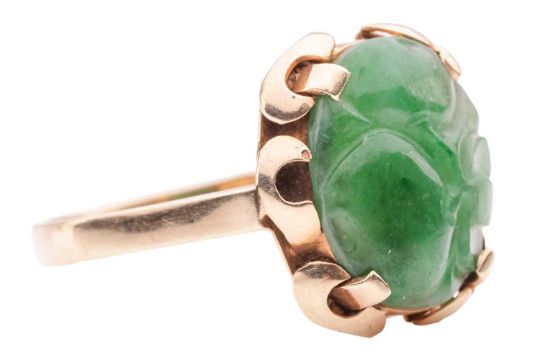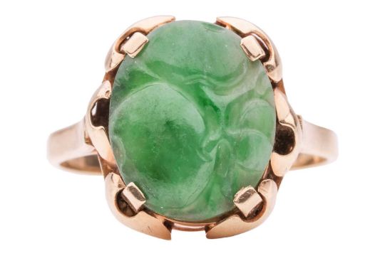 A carved jadeite ring; the oval-shaped carved jade depicting fruits, approximately 12.0 x 10.0 mm, in a sinuous mount leading to a flat shank, yellow metal struck with Dutch oak leaf mark for 14ct, size N½, 2.7 grams.