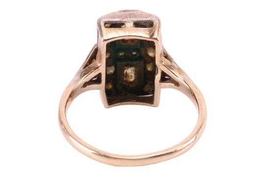 An Art Deco style panel ring; the rectangular head collet-set with two emerald-cut beryls, surround and shoulders encrusted with brilliant-cut diamonds (one deficient), unmarked metal testing as silver on 14ct, ring head 1.4 x 0.9 cm, size O½, 3.3 grams.