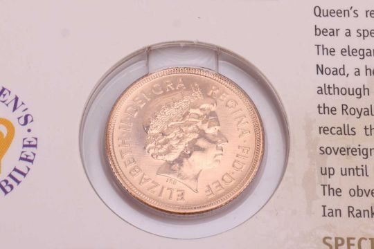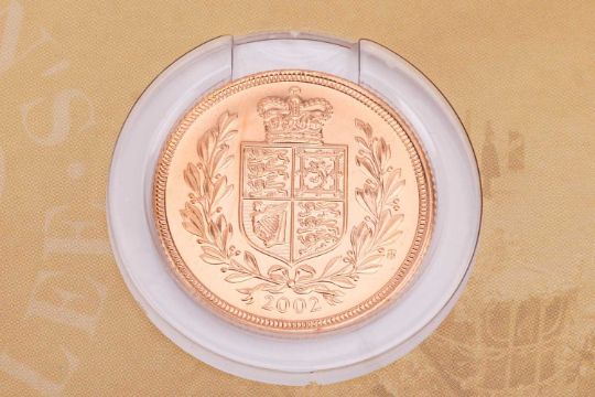 A 2002 Elizabeth II sovereign, in Royal Mint 'Bullion' packaging.