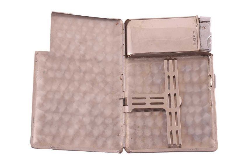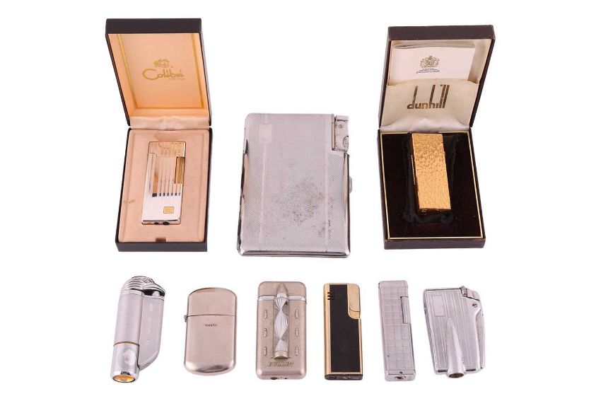 A Dunhill gold-plated Rollagas lighter, with textured finfish, in fitted Dunhil case; together with a Bullet lighter with a glass helix inset to the front, a cased Colibri lighter; a chrome Seigneur patented lighter-cum-cigarette case and five further lighters (9).