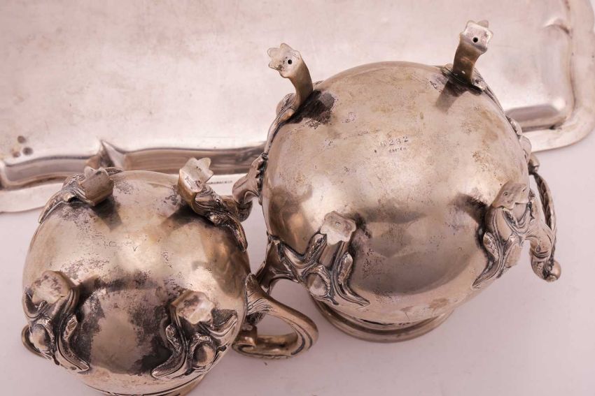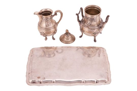 A German milk jug, a matching twin-handled sugar bowl and an unassociated tray; the milk jug and sugar bowl with cover, both of baluster form, with a reed on the belly and laurel swag decorations, supported on four scrolled feet, marked with German assay marks '800'; the rectangular tray with piecrust edge, stamped 'Margraf Co.' and German marks for 800 silver; total weight of items 1056.89 grams (33.98ozt) (3).