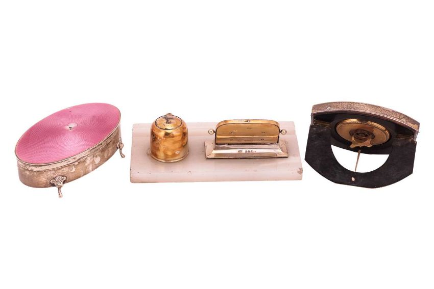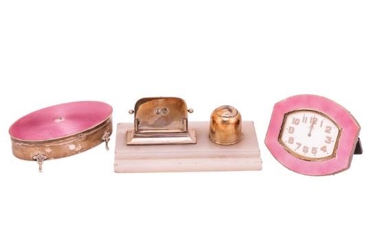 A group of desk accessories; comprising a silver jewellery box with pink guilloche enamel detail, Birmingham hallmarks, dated 1924, makers mark for Henry Matthews; a silver desk calendar together with a silver inkwell, Birmingham hallmarks, dated 1923, makers mark for Wilmot Manufacturing Co; together with a pink guilloche enamel desk clock (3).