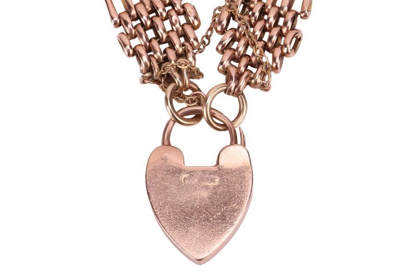A Byzantine link necklace in 9ct gold, completed with spring-ring clasp, British assay marks, 39.0 cm long; together with a gate link bracelet with heart-shaped locket clasp, pink metal marked '9ct', overall length 20.0 cm; Total weight of items 29.7 grams. (2)