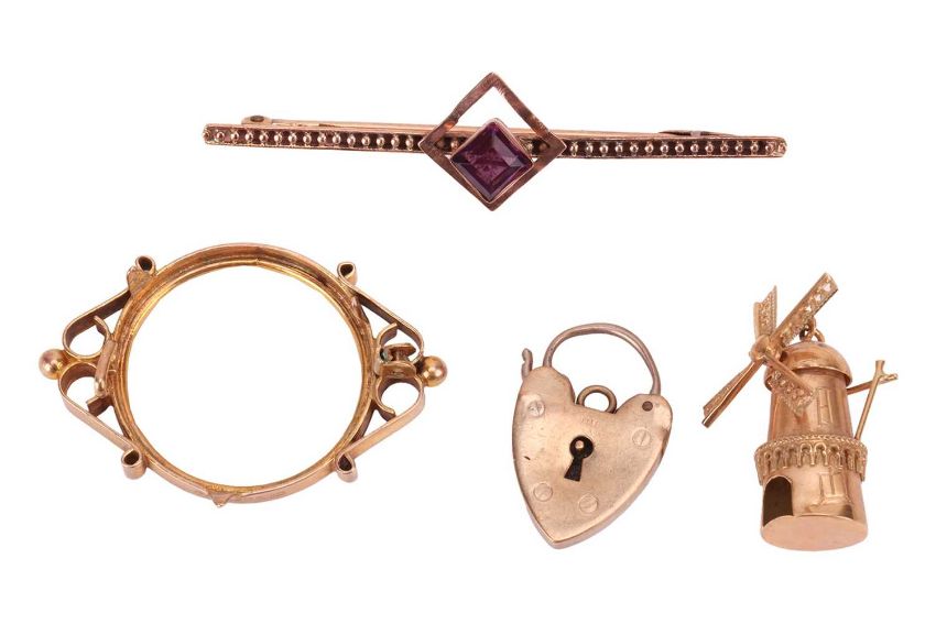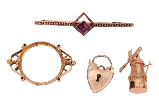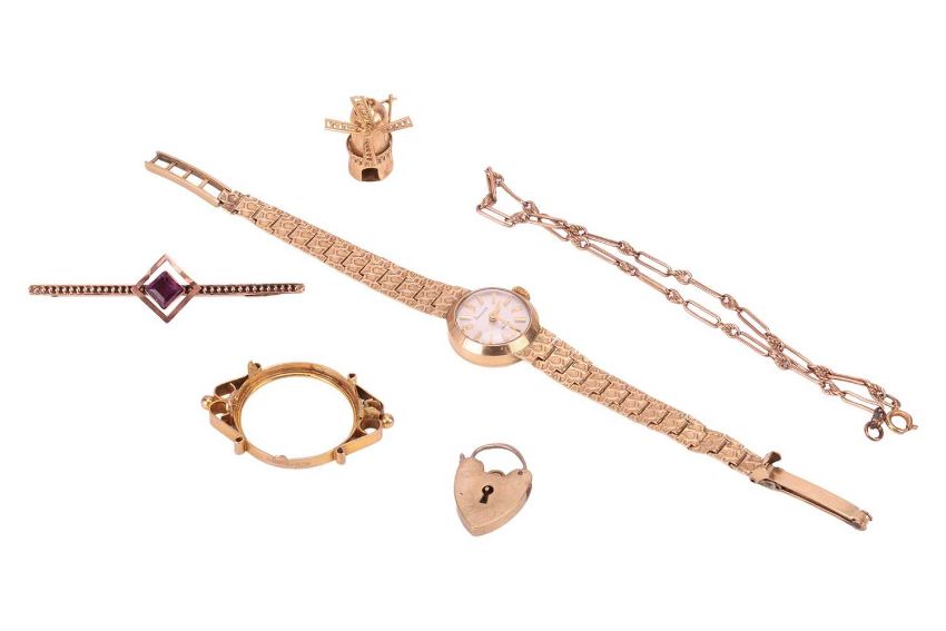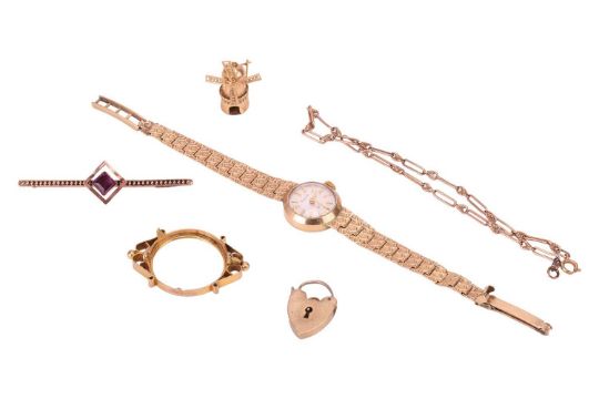 A group of jewellery, comprising a 9ct gold Accurist lady’s wrist watch, a 9ct gold heart padlock charm, a 9ct gold sovereign mount, a bracelet testing as 10ct, a gem-set bar brooch with granulation detail, testing as 10ct gold; Total gross weighable approximately 4.7 grams (6).