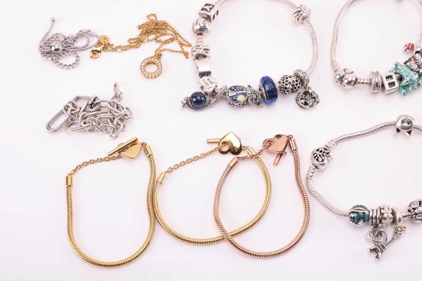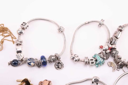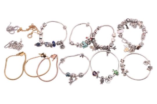 A quantity of Pandora sterling silver jewellery, to include: five snake chain bracelets featuring various beads and charms, five chain bracelets, two charm bangles and a chain necklace with circular pendant, total weight 345.4 grams.