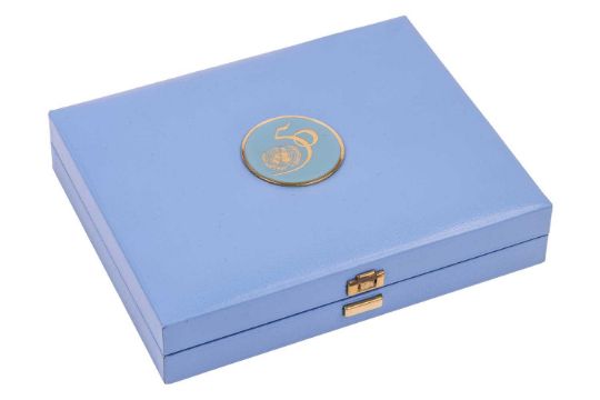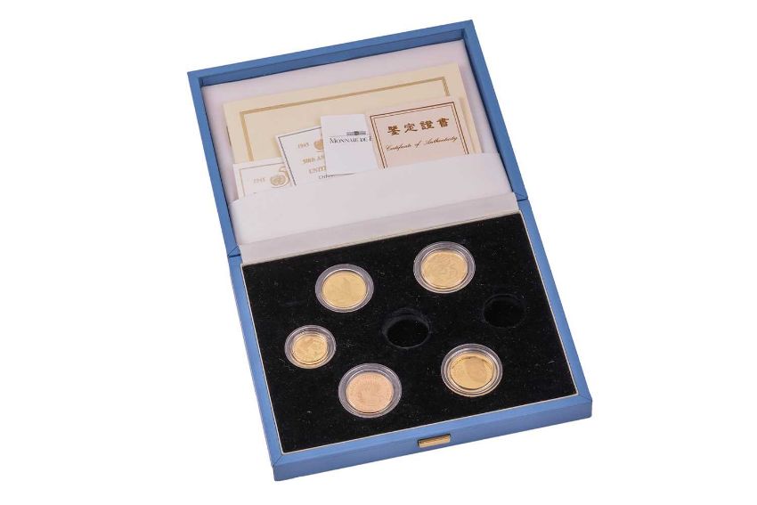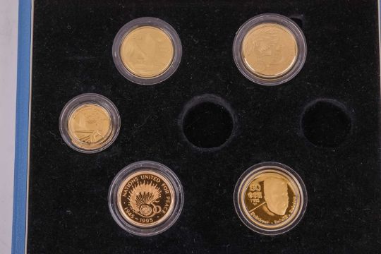 1995 United Nations 50th Anniversary Collection, missing two, comprising; 50 rouble, gold fineness 999/1000, diameter 22.6 mm, 7.78 grams; £2, 22ct gold, diameter 28.40 mm, 15.98 grams; 5 franc, gold fineness 920, diameter 28.85, 14 grams, 50 yuan, gold fineness 99.9%; 50 ECU, gold fineness 0.999, diameter 29 mm, 15.56 grams, encapsulated to fitted box with papers.