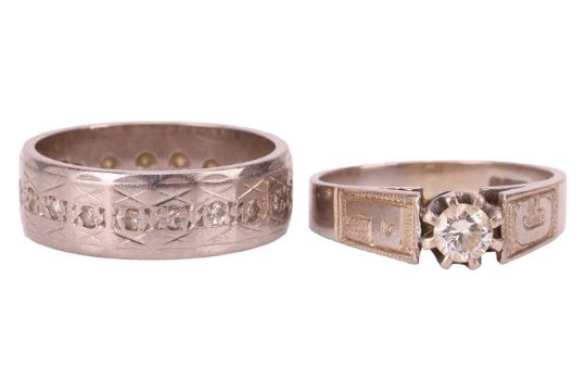 A collection of jewellery items; comprising a diamond solitaire ring, featuring a round-brilliant diamond with an estimated carat weight of 0.20ct, in an 18ct white gold mount with raised shoulders engraved "C" "P", size K1/2, together with an 18ct gold diamond-set band, size L, a paste-set necklace in yellow metal marked '9ct', a trace link chain marked '9ct', and several pairs of earrings, marked '9ct' and '375' and gilt earring backs; total weighables:13.7 grams