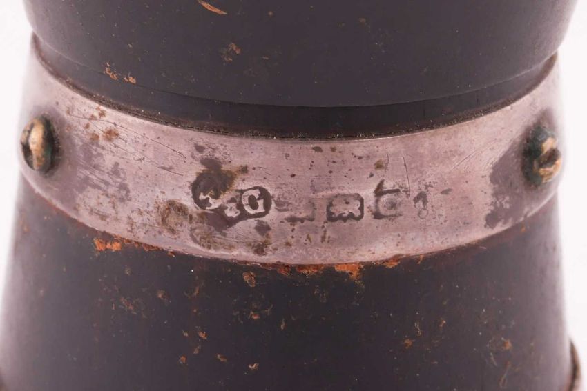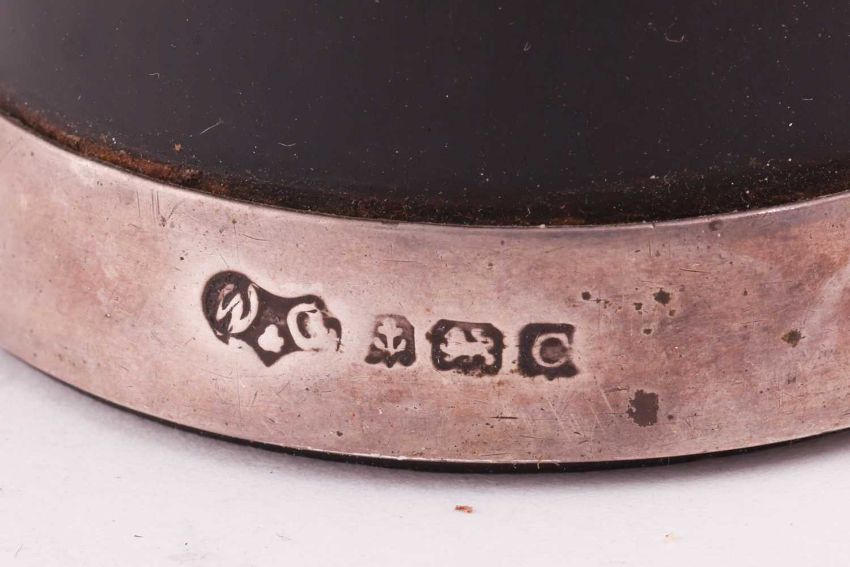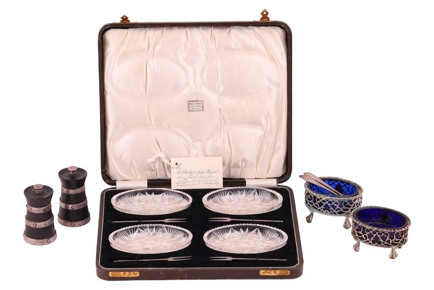 A pair of Irish George IV silver oval salts; Whytock and Sons of Dundee cut-glass sweet meat set, with silver two-tined forks, in presentation case, provenance Sir Charles Barrie; a pair of silver mounted churn-form ebony pepper mills, Birmingham 1927 by Wilson and Gill and a pair of bright-cut condiment spoons (4).