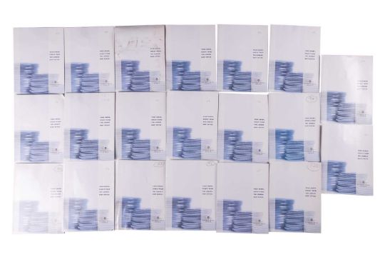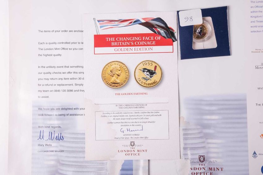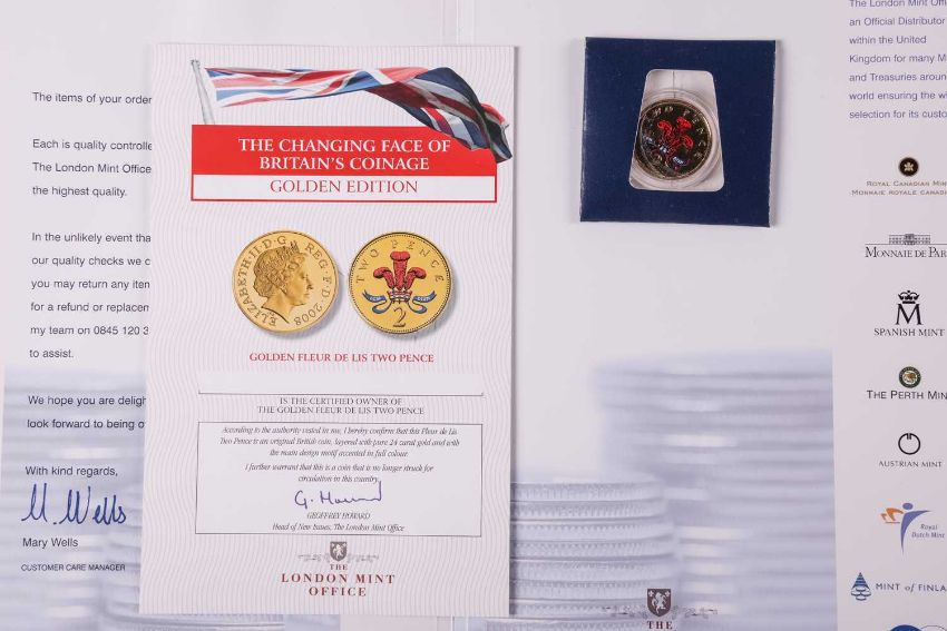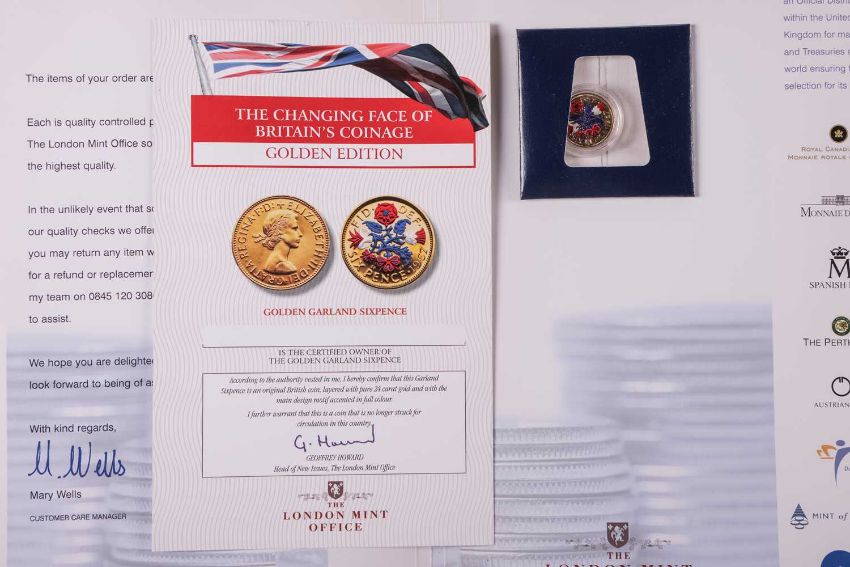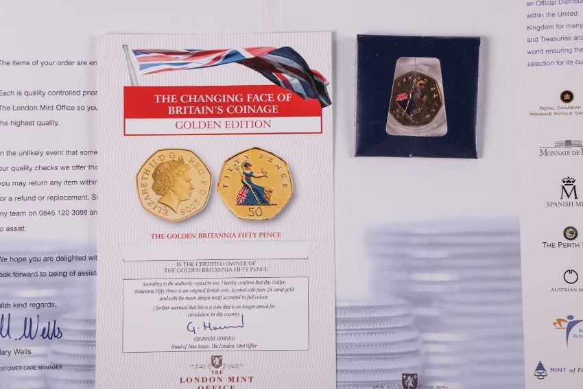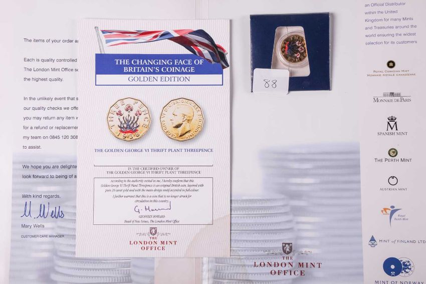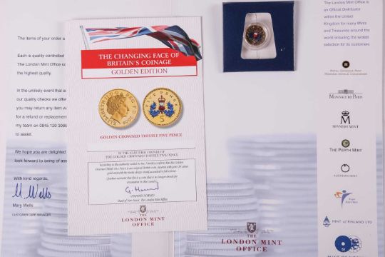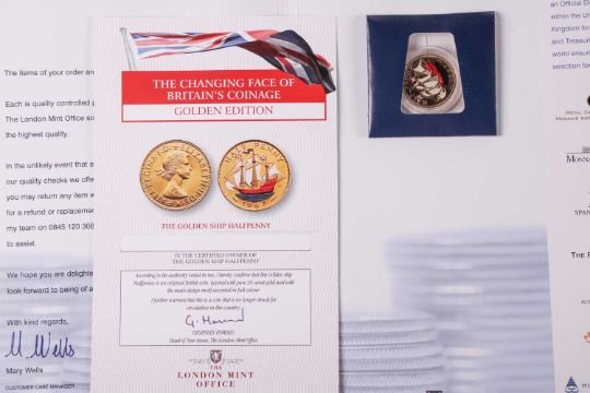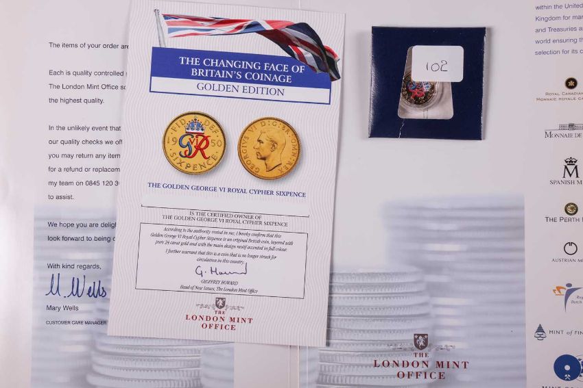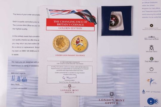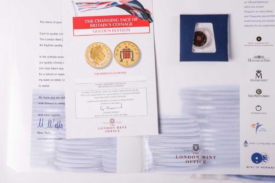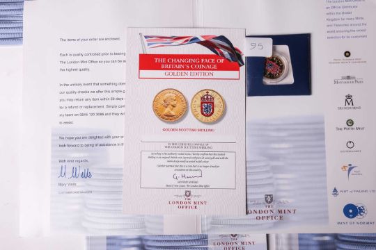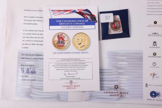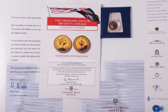 A large collection of London Mint Office issued UK commemorative coins; 'The Changing Face of Britain's Coinage', variously in cupronickel and bronze with gold plating, the majority of certificates present, comprising: Golden Royal Half Penny, Golden Lion Passant Ten Pence, Golden George VI Royal Cypher Sixpence, 'Wren' Farthing, Golden English Shilling, Golden Scottish Shilling, Golden Tudor Rose Twenty Pence, Golden Crowned Thistle Five Pence, Golden Half Crown, Golden Garland Sixpence, Golden Tudor Rose Florin, Golden One Pound, 1939 'Wren' Farthing, Golden George VI English Shilling, George VI Thrift Plant Threepence, Fleur de Lis Two Pence, Ship Halfpenny, Britannia Fifty Pence, Portcullis Penny, 1967 Britannia Penny and 1957 Threepence.