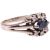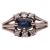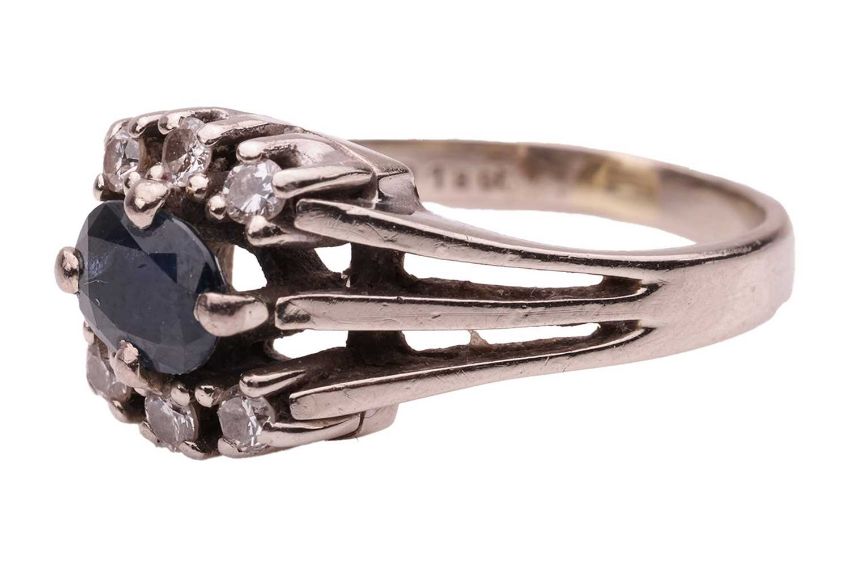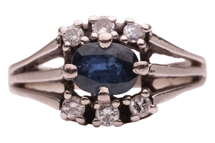 A sapphire and diamond ring; centred with an oval-cut sapphire of 5.6 x 4.5 x 2.4 mm, embellished with six brilliant-cut diamonds to the sides, between trifurcated shoulders leading to a flat shank, in white metal marked '585', ring head 8.2 x 9.4 mm, size K, 3.8 grams.