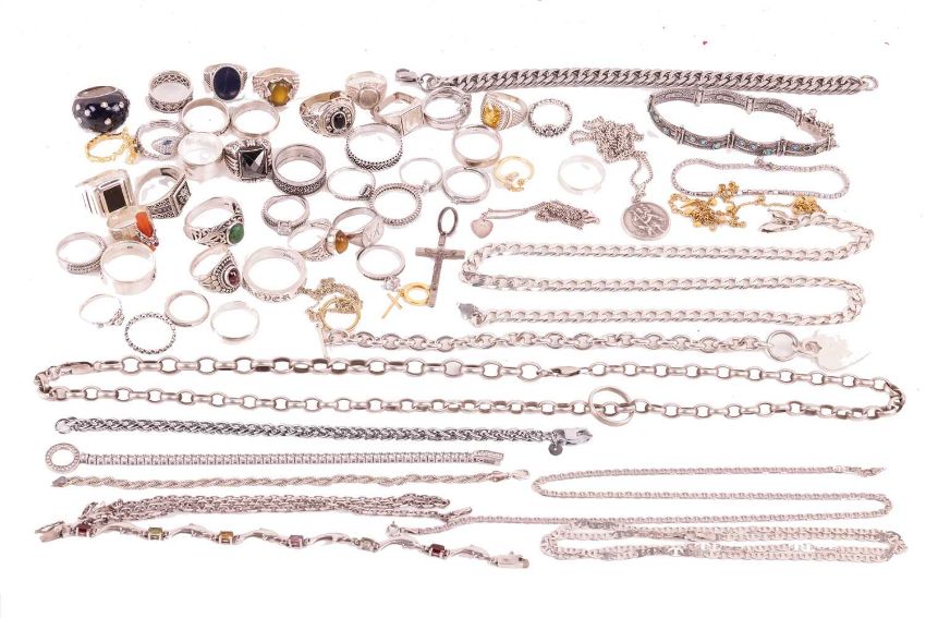 A large quantity of jewellery; to include a Chrome Hearts ring, a heavy curb link chain, a simulated opal bracelet, together with other rings, chains, pendants and bracelets, majority stamped 925, total weight 516.3 grams.