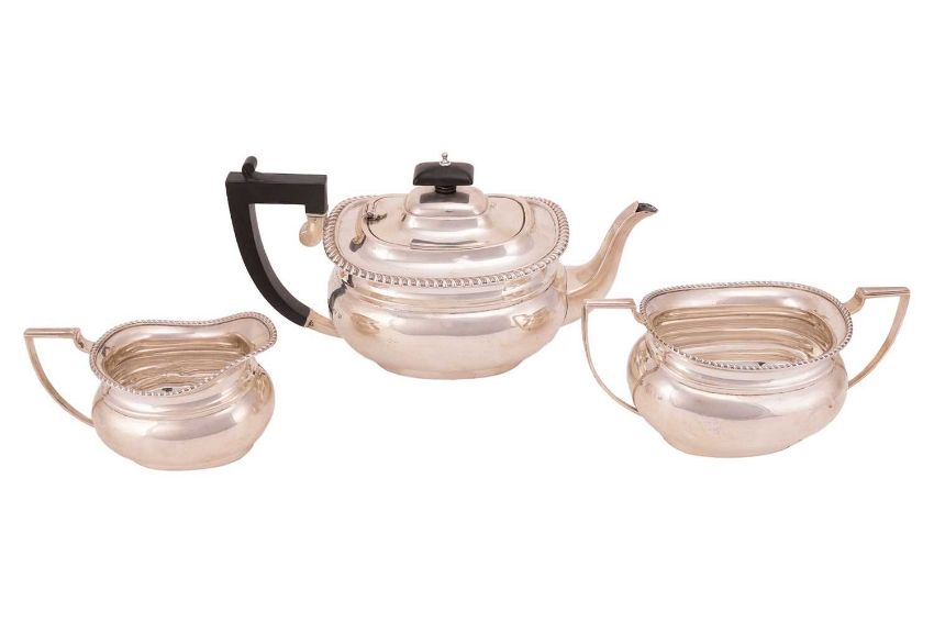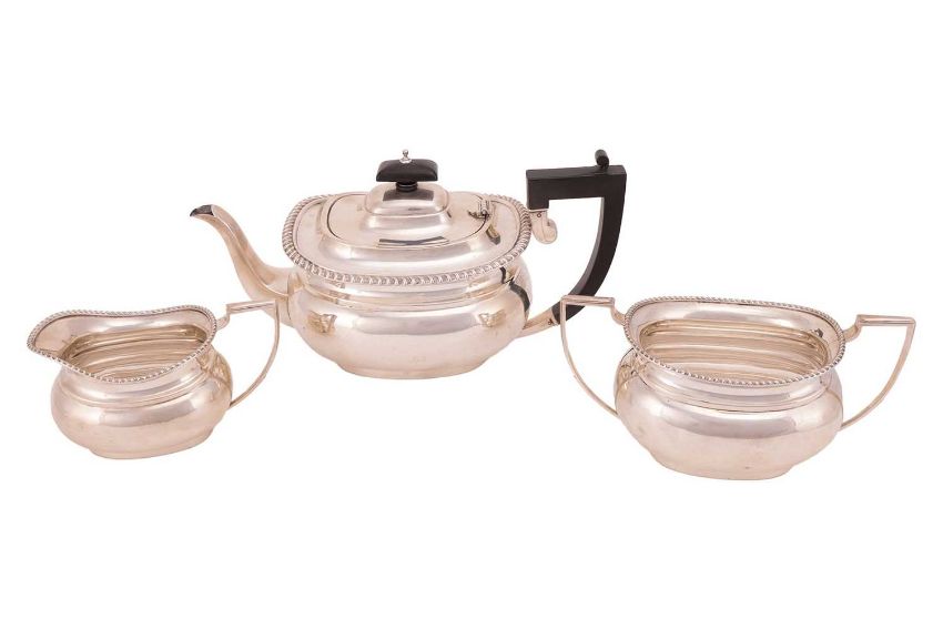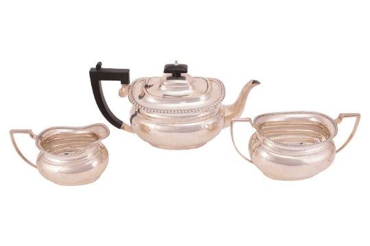 A three-piece silver tea set, comprising a teapot, milk jug and two-handled sugar basin, of oval form with ridged borders, the teapot with hardwood fittings, by Barker Brothers Silver Ltd, hallmarked Birmingham 1937; 1036.05 grams (33.31 ozt).