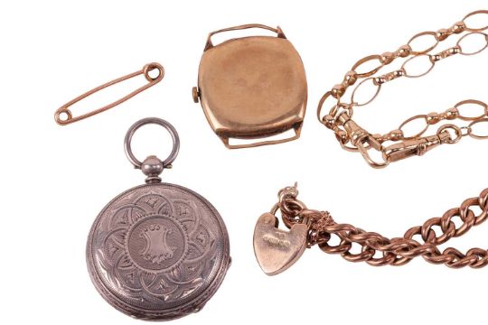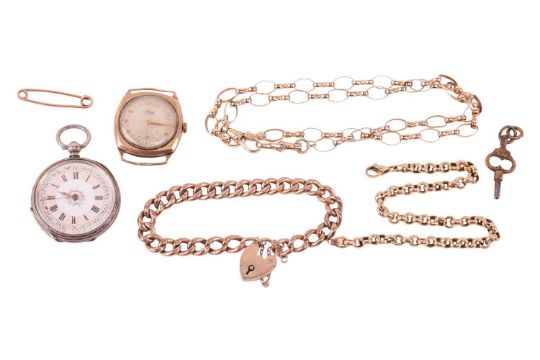 A group of chains and timepieces, comprising a 9ct gold curb-link bracelet completed with 9ct gold heart padlock, a 9ct gold cable link bracelet with lobster clasp, a fancy-link chain completed with two lobster clasps marked ‘375’, together with an Avia wrist watch in 9ct gold case and a silver pocket watch with engraved detail and foliate dial, accompanied by associated watch key and a yellow metal safety pin; Gross weight 83.3 grams (7).