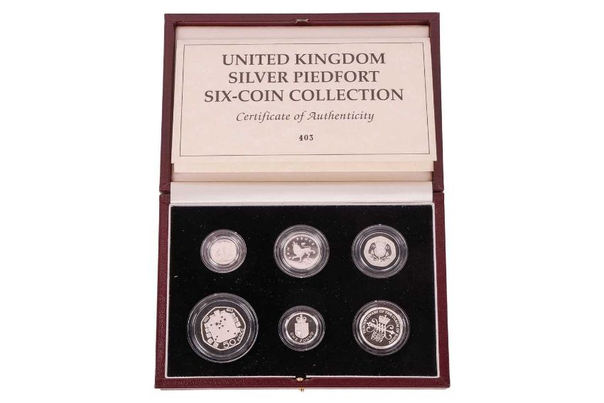 United Kingdom Piedfort Six-Coin Collection, approximately 107.46 grams total, encapsulated and boxed.