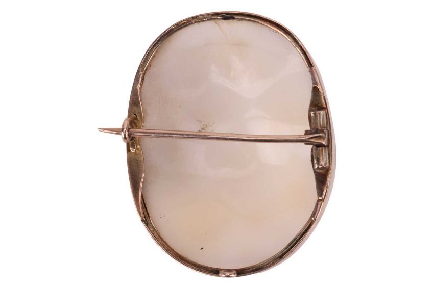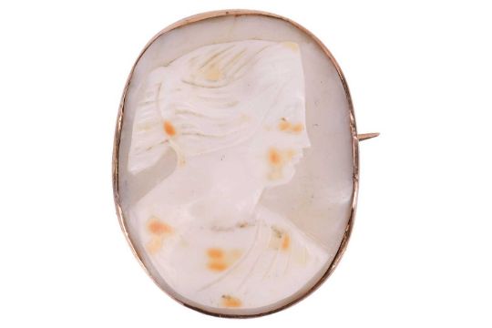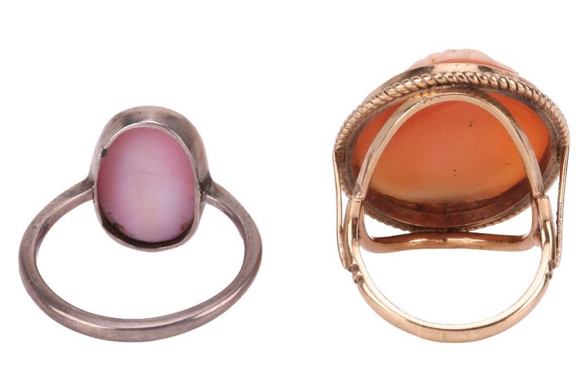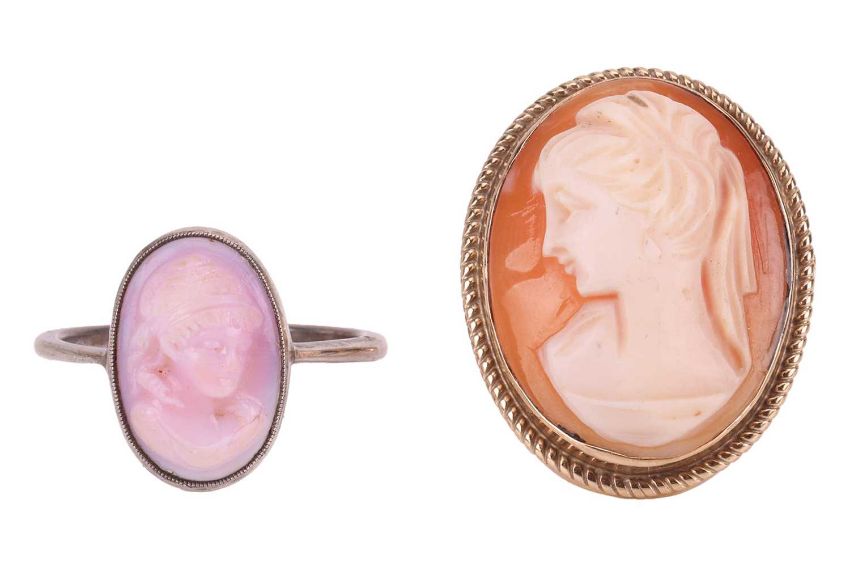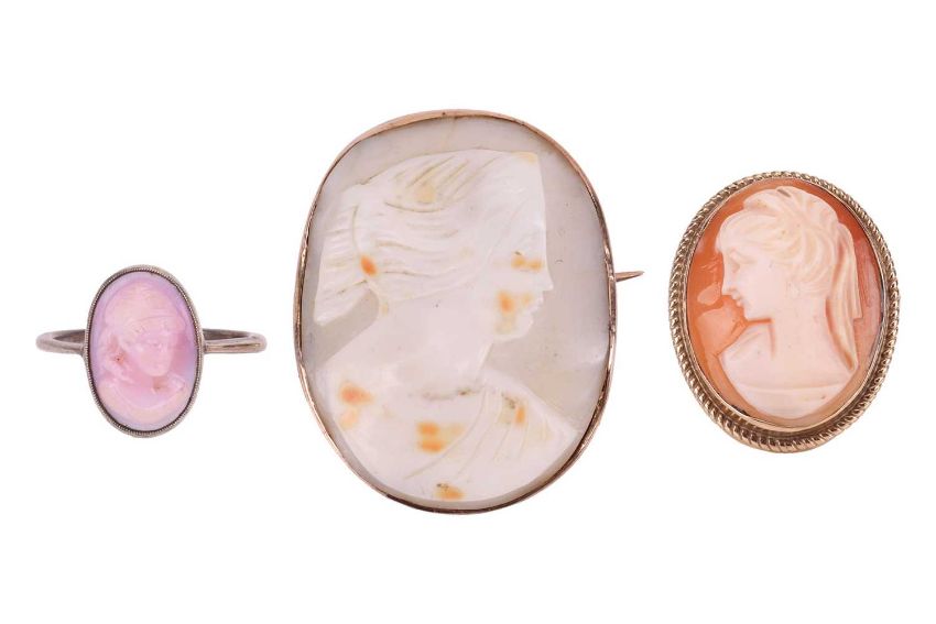 A group of three cameos; to include a resin cameo ring, to a bezel-set mount with a twisted rope border and raised gallery with trifurcated shoulders, in unmarked yellow metal testing as 9ct, ring head measuring approximately 25 x 30 mm, size M 1/2, 7 grams; together with a carved shell cameo of 35 x 45 mm, in a bezel setting of unmarked yellow metal testing as 9ct, with pin and c-clasp to reverse, 8.6 grams; and a glass cameo ring, ring head 12 x 17mm, bezel set with millgrain detail, to an unmarked white metal band, size S, 3.3 grams. (3)