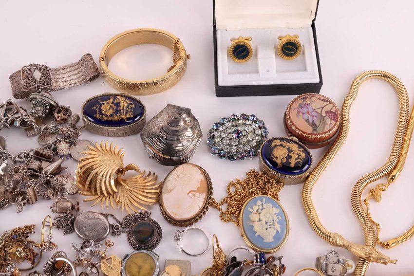 A large group of costume jewellery, comprising an engraved white metal locket and chain, a charm bracelet, two white metal trinket boxes with hinged covers, a white metal box in the form of an oyster, a collection of earrings and earring backs, along with others; Gross weight approximately 1717.3 grams.