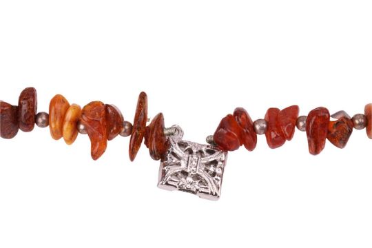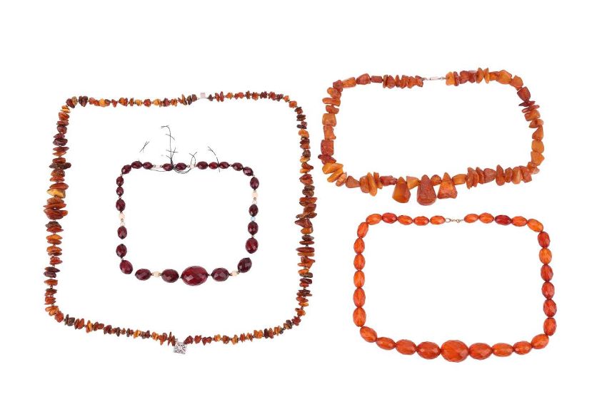 A collection of amber necklaces and a red bead necklace, comprising a graduated faceted oval bead necklace, 56cm in length; a graduated rough amber bead necklace, 59cm in length; a two strand graduated rough amber bead necklace, interspersed with white metal beads, 46cm in length; A graduated faceted red bead necklace, approximately 22cm in length; Gross weight 190.3 grams (4).