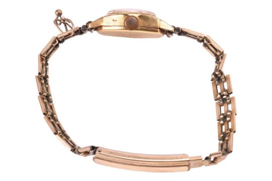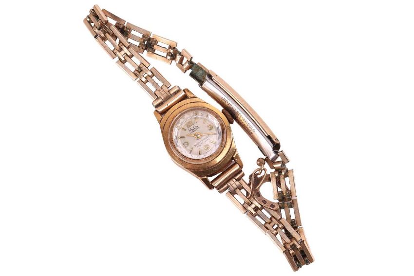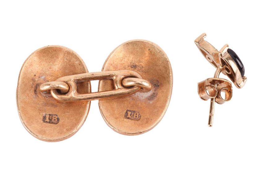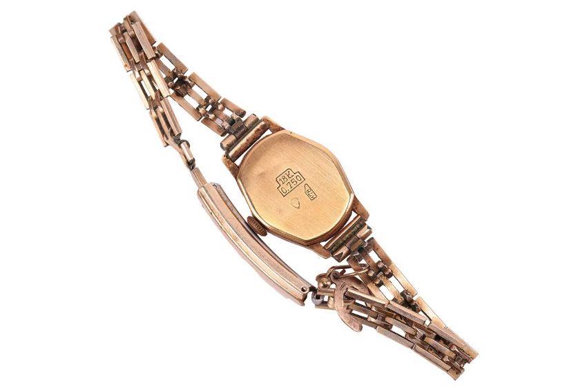 An 18ct gold lady’s wristwatch with rolled-gold strap, Swiss hallmark, accompanied by a horseshoe charm stamped ‘375’, a single cufflink testing as 18ct and a single gold-plated earring; Gross weight 19.9 grams (3).