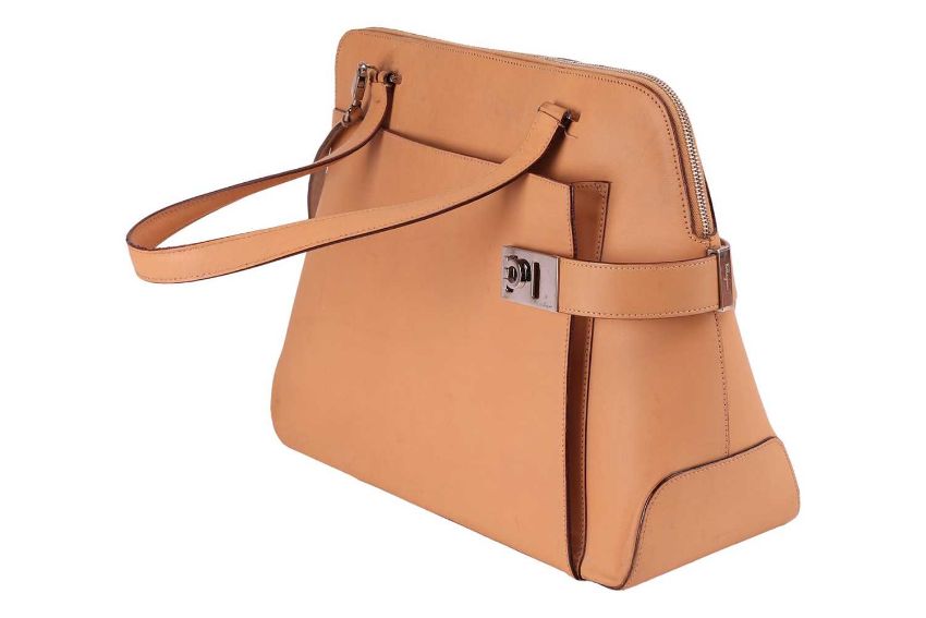 Salvatore Ferragamo - a Boston bag in tanned leather, top zip closure, equipped with two shoulder handles and a detachable crossbody strap, with Gancini lock detail to the front, supported on five studded feet, silver-tone hardware.